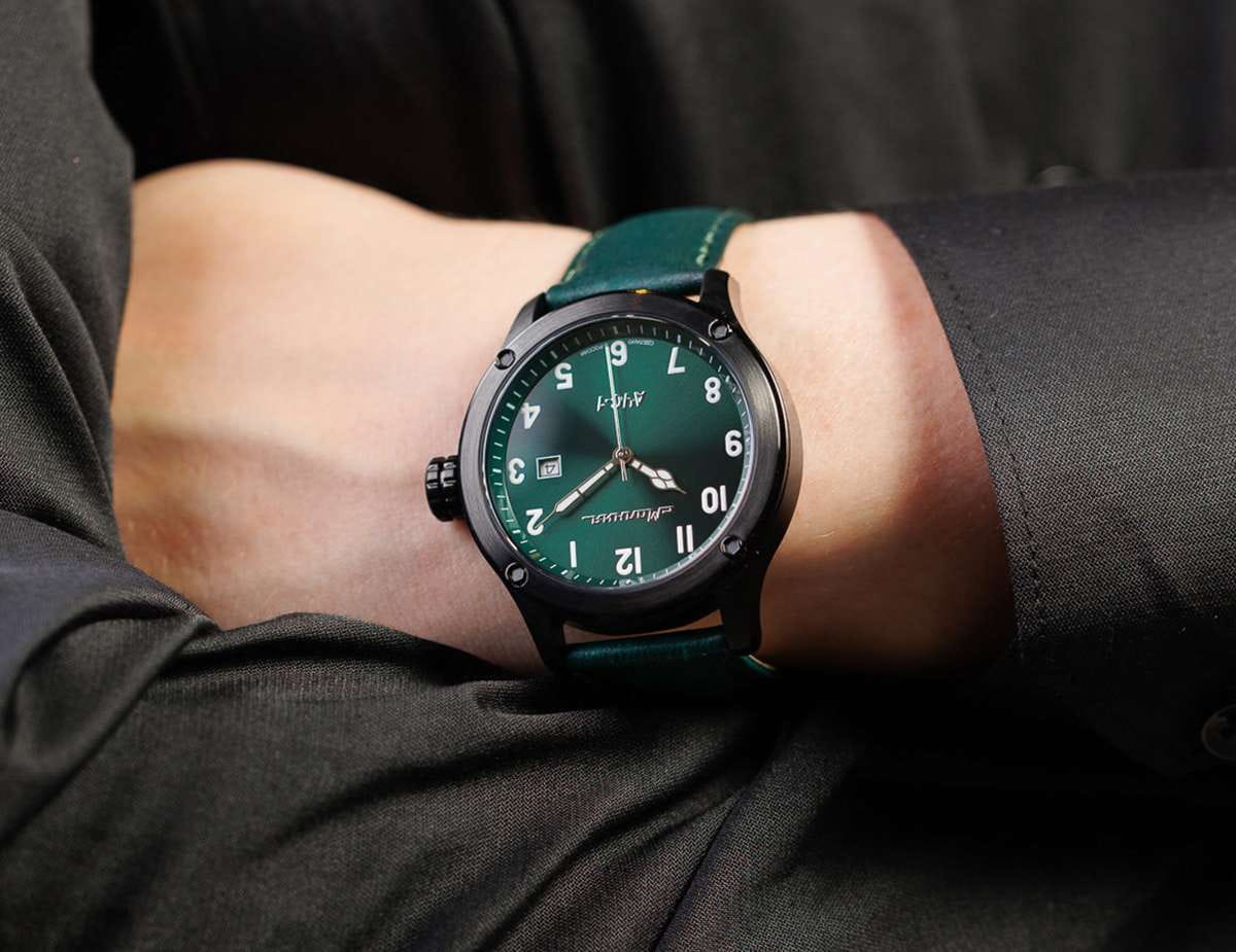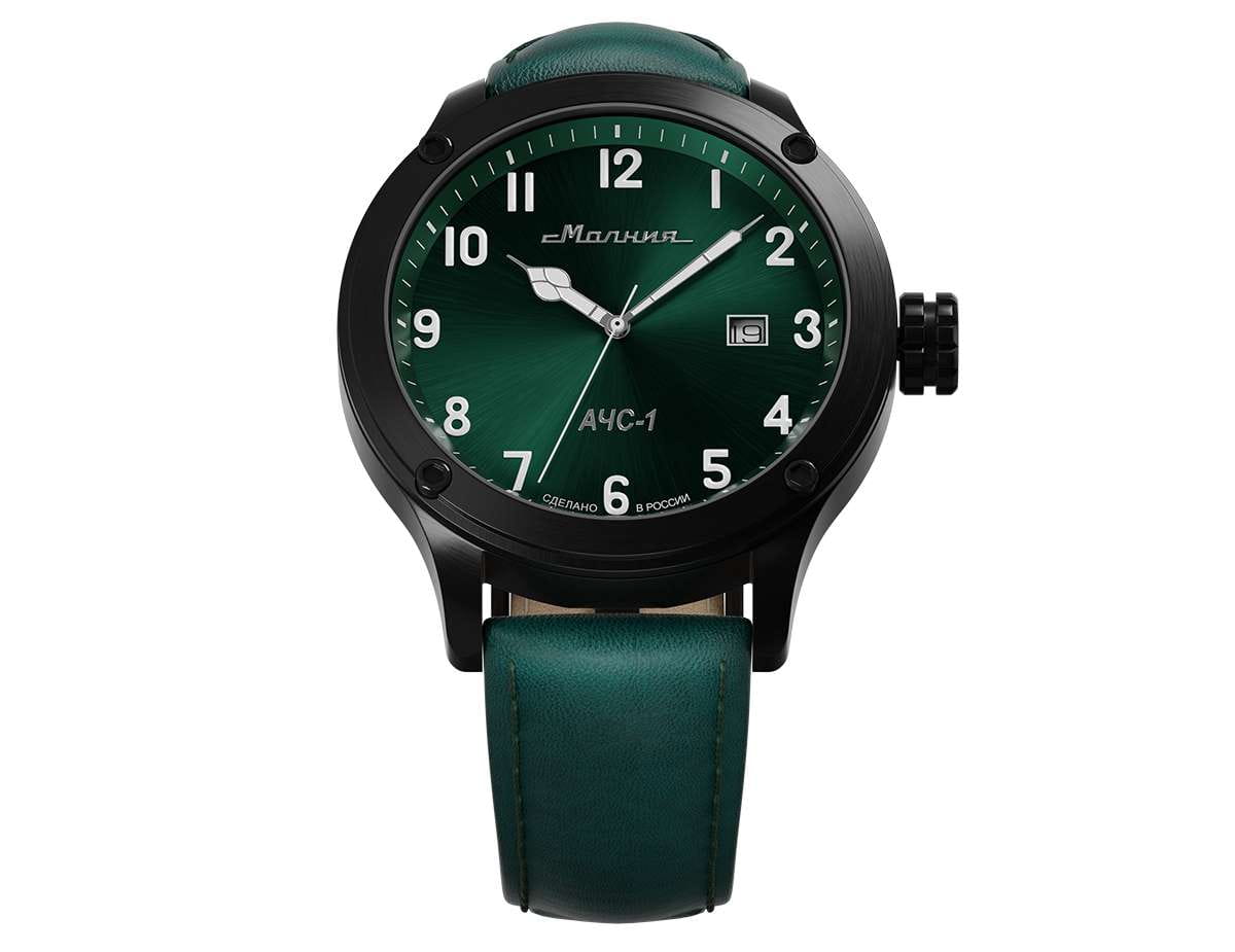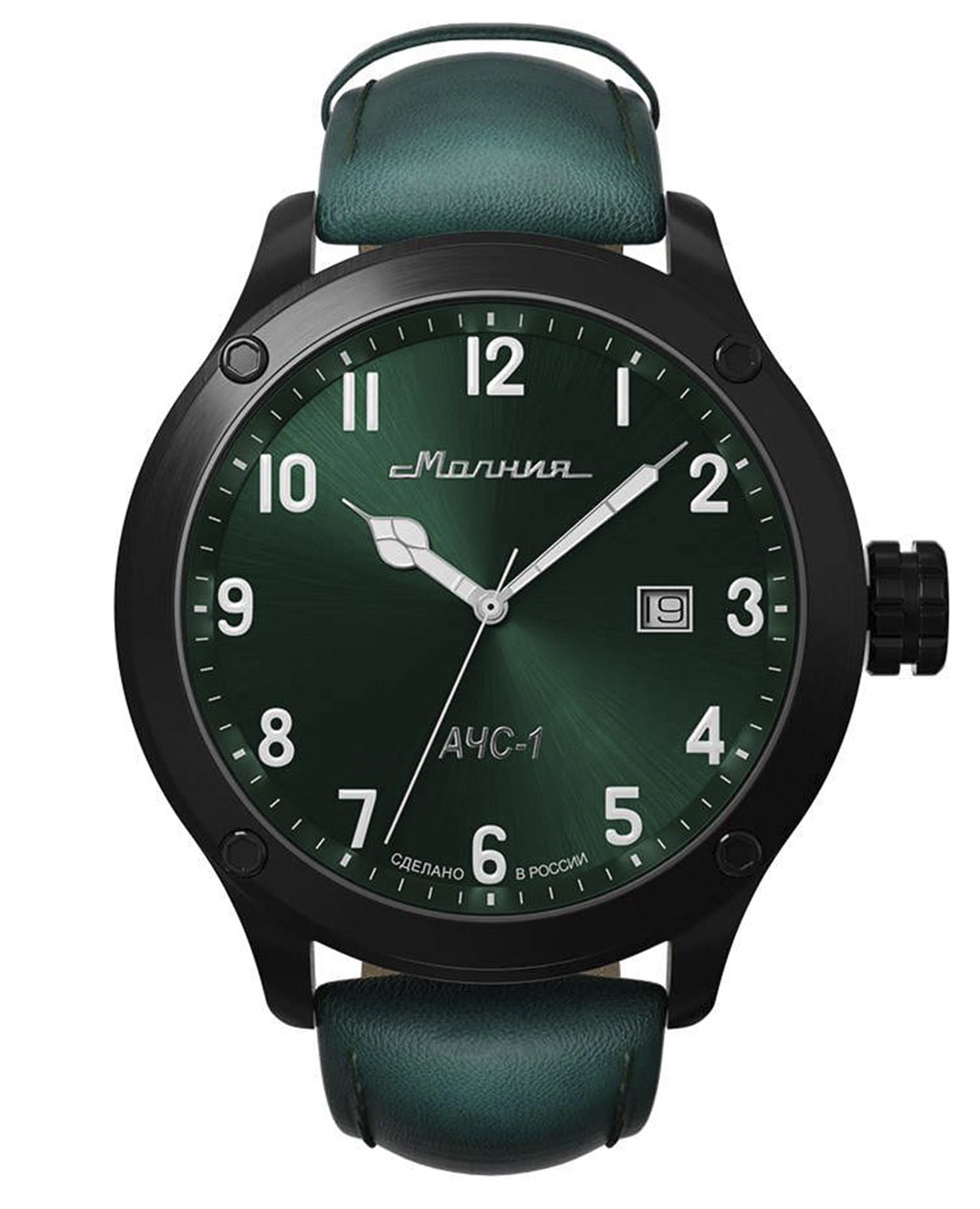 Мужские механические часы с автоподзаводом — это надёжный аксессуар от легендарного бренда «МОЛНИЯ», созданного на Челябинском часовом заводе. Корпус диаметром 44 мм и высотой 12 мм выполнен из нержавеющей стали 316L с IP-покрытиемIP-покрытиеМетод ионного напыления. Демонстрирует повышенную устойчивость к истиранию, окислению и химическим веществам. Под воздействием высокого давления и температуры около 1500°C молекулы металла надёжно соединяются с частицами корпуса часов.. Циферблат зелёного цвета матовый, оформлен стрелками и индексами с люминесцентным покрытиемЛюминесцентное покрытиеПозволяет считывать показания времени в темноте. Производители наносят на стрелки, часовые индексы, безель или поверхность циферблата светонакопительный состав, дающий холодное свечение. Super-LumiNova. Окошко даты расположено в положении 3 часов. Циферблат защищён сапфировым стекломСапфировое стеклоПрочный и надёжный материал из кристалла сапфира синтетического происхождения, характеризующийся особой твёрдостью и устойчивостью к царапинам и повреждениям. толщиной 1,5 мм. Механизм — японский автоматический калибр Miyota 8215 с функцией и запасом хода 42 часа. Часы оснащены кожаным ремешком зелёного цвета шириной 22 мм с классической пряжкой. Водонепроницаемость 100 м позволяет использовать часы для плавания и повседневного ношения. Идеальный выбор для тех, кто ценит российское качество и мужественный дизайн.
