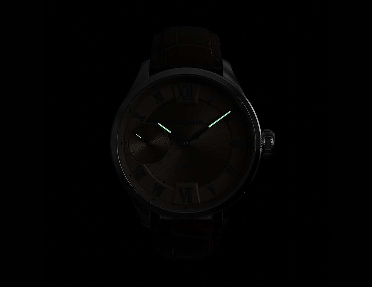 Мужские механические часы с ручным подзаводом — это аксессуар от легендарного бренда «МОЛНИЯ», созданный на Челябинском часовом заводе. Корпус диаметром 41 мм и толщиной 12 мм выполнен из нержавеющей стали 316L с зеркальной полировкой. БезельБезельВнешний ободок, закрепляющий стекло. В спортивных часах так называется поворотное кольцо с делениями на циферблате, выполняет роль таймера – замеряет отрезки времени на шкале. Неподвижный безель – элемент декора. Однонаправленно вращающийся безель на дайверских часах позволяет фиксировать моменты погружения и выныривания на поверхность. также выполнен из стали с зеркальной отделкой. Циферблат бежевый цвета оформлен римскими цифрами и стальными индексами. Малая секундная стрелка вынесена на позицию 9 часов. Циферблат защищён сапфировым стекломСапфировое стеклоПрочный и надёжный материал из кристалла сапфира синтетического происхождения, характеризующийся особой твёрдостью и устойчивостью к царапинам и повреждениям. толщиной 2,5 мм. Механизм — мануфактурный калибр 3603, собранный вручную, с запасом хода до 40 часов. Прозрачная задняя крышка позволяет наблюдать за работой механизма. Часы оснащены коричневым кожаным ремешком шириной 20 мм с раскладной застёжкойРаскладная застёжкаТакой тип застёжки используется только на браслетах из металла. Она никогда не раскрывается полностью, происходит разделение на 2 и более частей. Раскладывающая застёжка снизит вероятность потери часов к минимуму. и системой быстрой замены. Водонепроницаемость 100 м позволяет использовать часы для плавания и повседневного ношения. Идеальный выбор для тех, кто ценит российское качество и традиции.