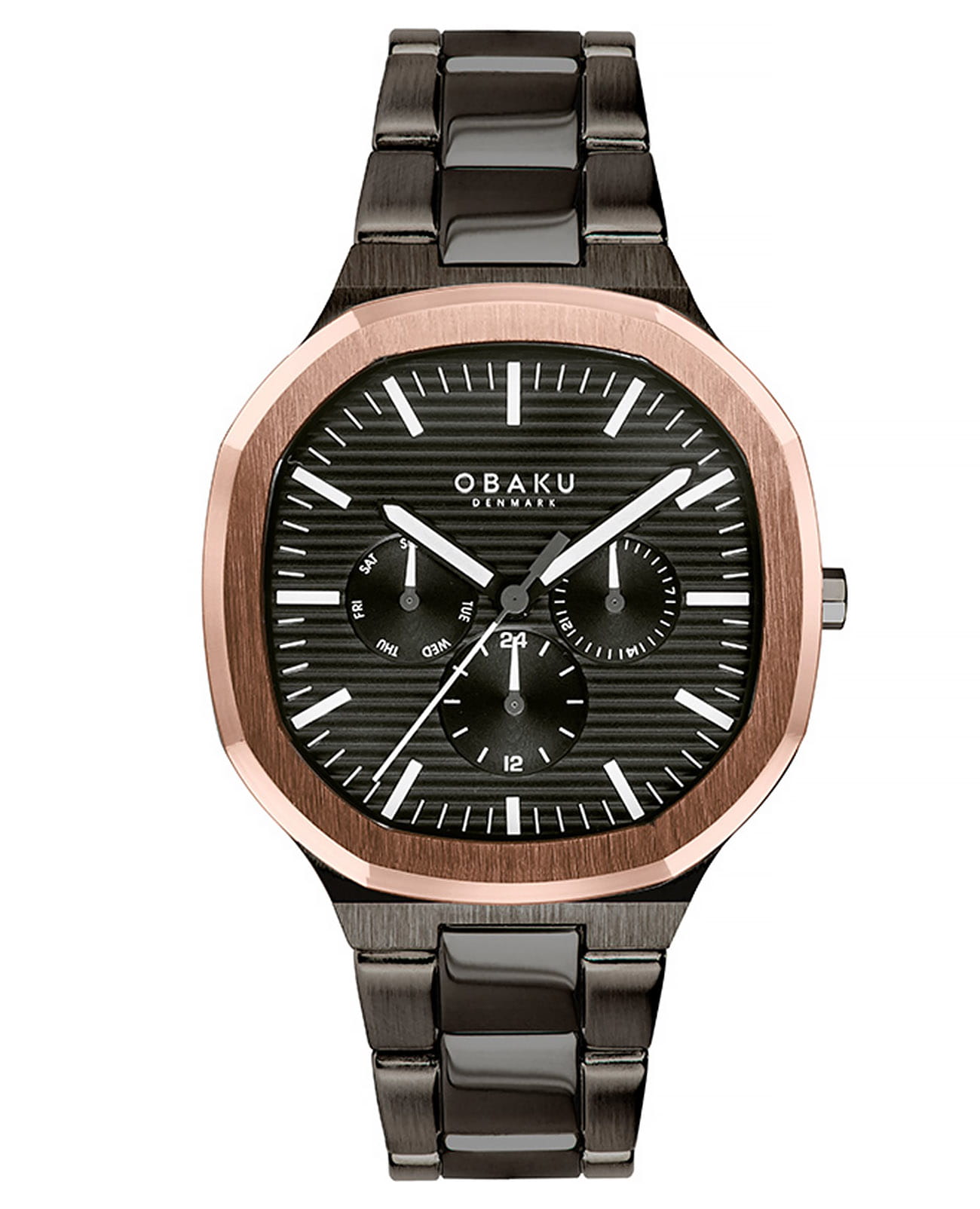 Мужские датские наручные часы Obaku Oktant V275GMMBSB, кварцевый механизм с высокой точностью. Минеральное стеклоМинеральное стеклоМинеральное стекло представляет собой искусственно выращенный минерал кварца. Такое стекло отличается особой устойчивостью к повреждениям и царапинам. Уступает по некоторым качествам сапфировому стеклу. устойчивое к появлению царапин, обладающее высокой прозрачностью. Класс водозащиты: 50 метров, позволит защитить корпус от случайных брызг или капель дождя. Корпус часов изготовлен из стали c IP-покрытиемIP-покрытиеМетод ионного напыления. Демонстрирует повышенную устойчивость к истиранию, окислению и химическим веществам. Под воздействием высокого давления и температуры около 1500°C молекулы металла надёжно соединяются с частицами корпуса часов. черного цвета и частичным покрытием цвета розового золота по безелюБезельВнешний ободок, закрепляющий стекло. В спортивных часах так называется поворотное кольцо с делениями на циферблате, выполняет роль таймера – замеряет отрезки времени на шкале. Неподвижный безель – элемент декора. Однонаправленно вращающийся безель на дайверских часах позволяет фиксировать моменты погружения и выныривания на поверхность.. Застёжка бабочка с кнопкамиЗастёжка "бабочка"Такой вид застёжки дополняется предохранителями, помогающими избежать случайного раскрытия браслета. Обладают изящным исполнением. .