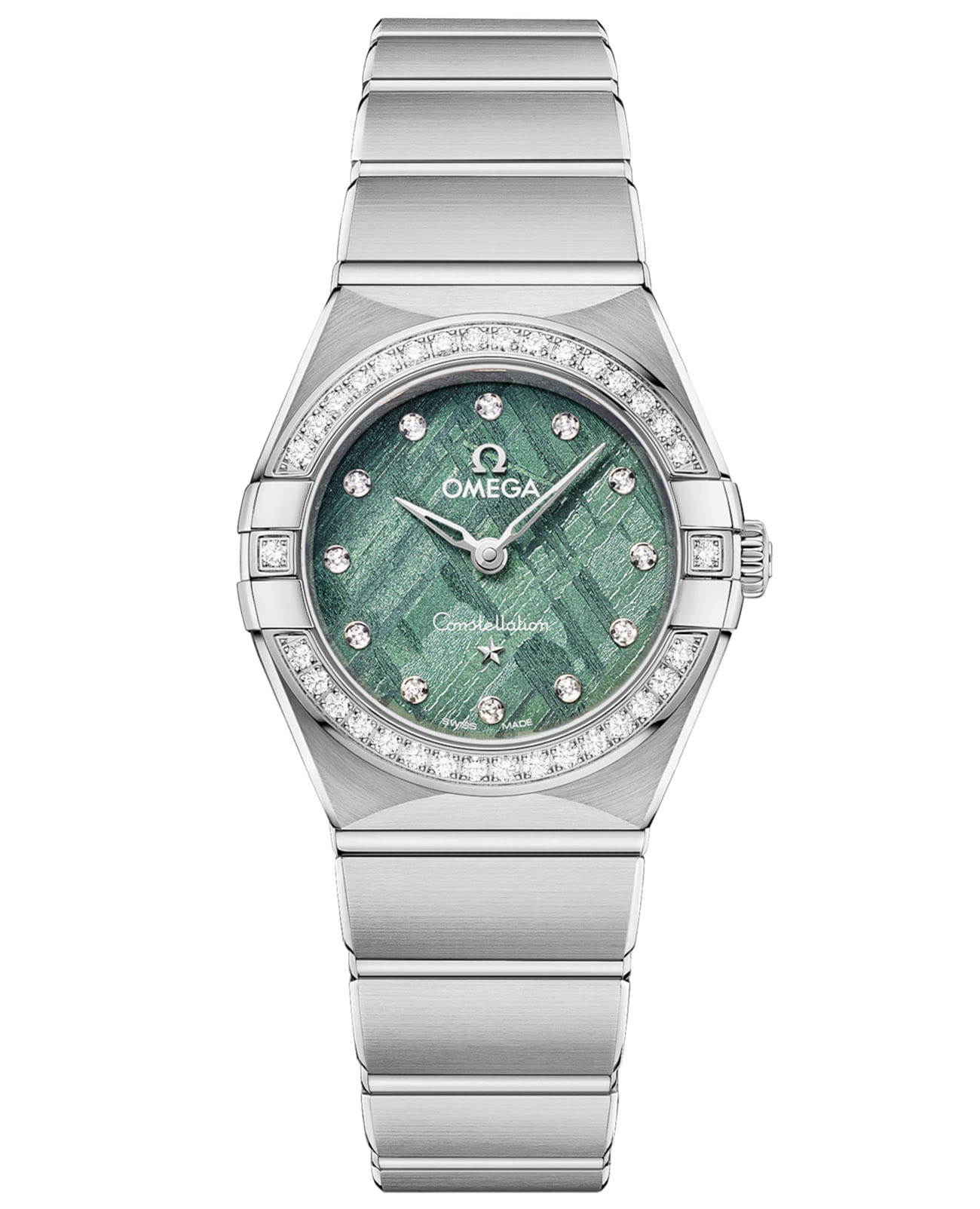 С 1952 года часы OMEGA Constellation черпают вдохновение в безупречной гармонии небесных светил. Эта уникальная модель продолжает звездную традицию, предлагая циферблат из подлинного железного метеорита - фрагмента космической истории на вашем запястье. 25-миллиметровый корпус с интегрированным браслетом из нержавеющей стали украшен характерными полукруглыми скосами и безелемБезельВнешний ободок, закрепляющий стекло. В спортивных часах так называется поворотное кольцо с делениями на циферблате, выполняет роль таймера – замеряет отрезки времени на шкале. Неподвижный безель – элемент декора. Однонаправленно вращающийся безель на дайверских часах позволяет фиксировать моменты погружения и выныривания на поверхность. с бриллиантовым паве, сверкающим как созвездие в зимнюю ночь. Циферблат из метеорита с зеленым покрытием демонстрирует неповторимый природный узор - каждая линия рассказывает историю его космического путешествия. Бриллиантовые часовые индексы и звезда Constellation из 18-каратного белого золота18-каратное золотоОбозначение по каратной системе пробирования, оно показывает, сколько драгоценного металла содержится в изделии. 18 карат - в составе 75% чистого золота, соответствует 750 пробе.