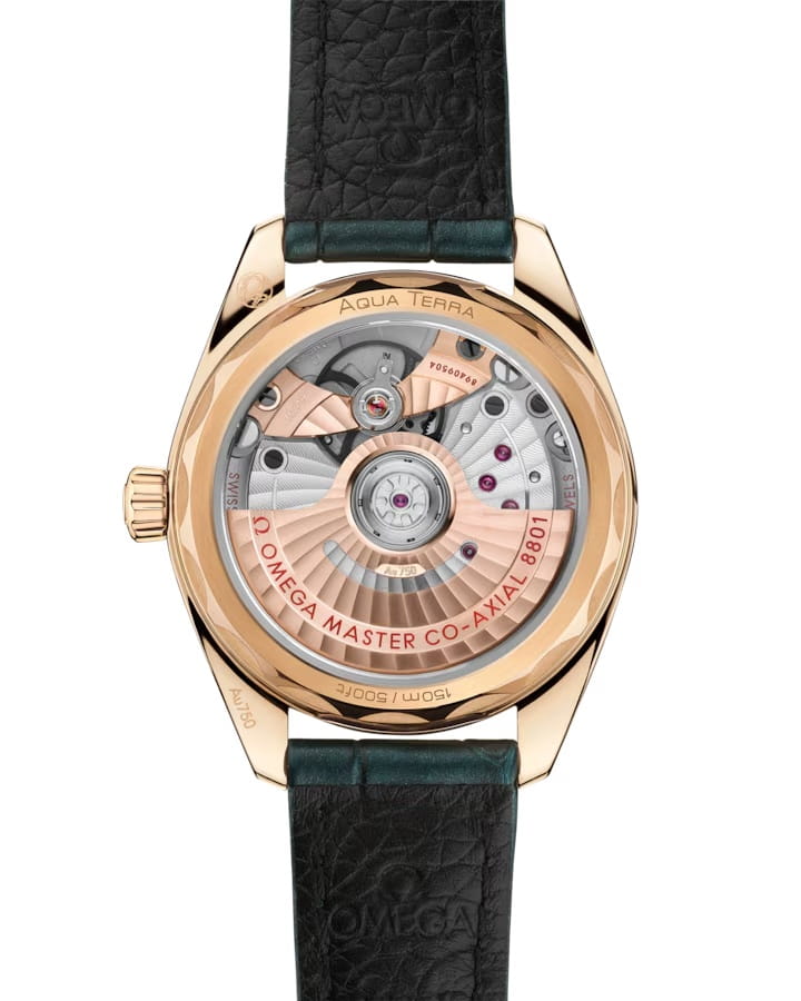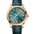 Часы Omega Seamaster Aqua Terra выполнены в симметричном корпусе из полированного 18K Moonshine™ золота с завинчивающейся задней крышкой, украшенной волновым узором. Модель дополнена конической заводной головкой и окошком даты на 6 часах, оформленным кольцом из 18K Moonshine™ золота. Циферблат лагунного оттенка обработан методом CVD и дополнен серебристыми вставками. Стрелки и метки выполнены из 18K Moonshine™ золота и оснащены люминесцентным покрытиемЛюминесцентное покрытиеПозволяет считывать показания времени в темноте. Производители наносят на стрелки, часовые индексы, безель или поверхность циферблата светонакопительный состав, дающий холодное свечение. Super-LumiNova для лучшей читаемости в темноте. Индексы в форме корпусов парусников подчёркивают морское наследие коллекции. Калибр Omega 8801 сертифицирован как Master Chronometer — гарантия высочайшей точности и устойчивости к магнитным полям. Запас хода составляет 55 часов. Защиту циферблата обеспечивает сапфировое стеклоСапфировое стеклоПрочный и надёжный материал из кристалла сапфира синтетического происхождения, характеризующийся особой твёрдостью и устойчивостью к царапинам и повреждениям. с антибликовым покрытиемАнтибликовое покрытиеСлой оксида металла в 0,13-0,3 микрон, благодаря которому стекло часов не бликует и не отражает свет. Антибликовое покрытие уменьшает отражение света в 10 раз, обеспечивая отличную читаемость показателей циферблата. с обеих сторон. Водозащита позволяет использовать часы в воде без риска повреждения. Часы установлены на кожаный ремешок изумрудного цвета. Вес модели — около 86 грамм. Это сочетание премиального качества, технологичности и классического дизайна.