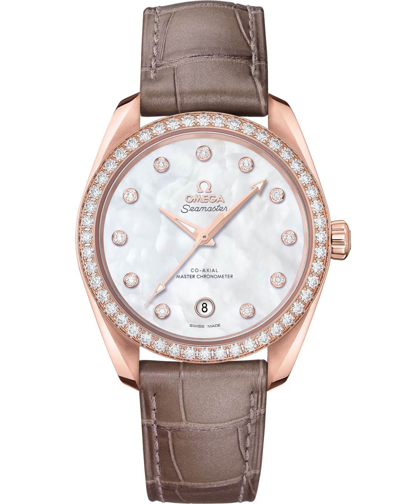Omega Seamaster Aqua Terra выполнены в симметричном корпусе из 18K Sedna™ золота с завинчивающейся задней крышкой, украшенной волновым узором. Циферблат дополнен окошком даты на 6 часах и 11 бриллиантами, установленными в держатели из 18K Sedna™ золота. Поверхность циферблата выполнена из перламутрового материала с переливающимся эффектом. Калибр Omega 8801 сертифицирован как Master Chronometer — гарантия высочайшей точности и устойчивости к магнитным полям. Запас хода составляет 55 часов. Защиту циферблата обеспечивает сапфировое стеклоСапфировое стеклоПрочный и надёжный материал из кристалла сапфира синтетического происхождения, характеризующийся особой твёрдостью и устойчивостью к царапинам и повреждениям. с антибликовым покрытиемАнтибликовое покрытиеСлой оксида металла в 0,13-0,3 микрон, благодаря которому стекло часов не бликует и не отражает свет. Антибликовое покрытие уменьшает отражение света в 10 раз, обеспечивая отличную читаемость показателей циферблата. с обеих сторон. Водозащита позволяет использовать часы в воде без риска повреждения. Часы установлены на кожаный ремешок с полированной застёжкой. Это сочетание премиального качества, технологичности и классического дизайна.