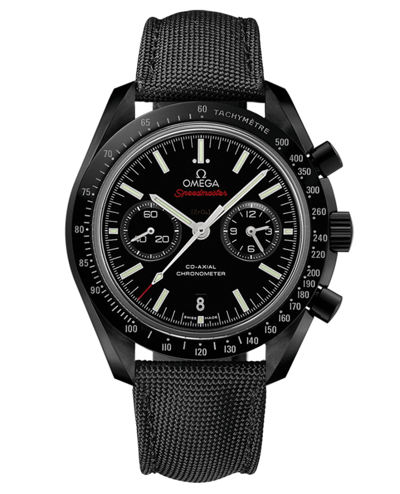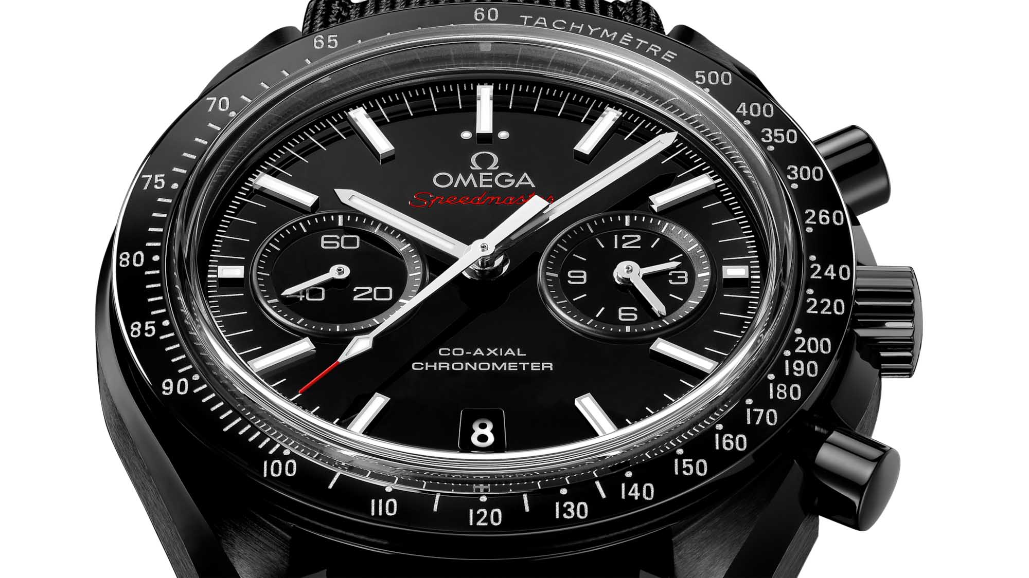 Speedmaster Dark Side of the Moon — завораживающая космическая интерпретация легендарных Moonwatch, будто созданная из самой тьмы Вселенной. 44,25-мм монокорпус из керамики с сатинированным керамическим безелемБезельВнешний ободок, закрепляющий стекло. В спортивных часах так называется поворотное кольцо с делениями на циферблате, выполняет роль таймера – замеряет отрезки времени на шкале. Неподвижный безель – элемент декора. Однонаправленно вращающийся безель на дайверских часах позволяет фиксировать моменты погружения и выныривания на поверхность. демонстрирует тахиметрическую шкалуТахиметрРазмеченная шкала, располагается на ободке или безеле часов. Тахиметр позволяет рассчитать скорость на определённом участке пути, расстояние измеряется в километрах или милях. в матовом нитрид-хромовом исполнении. На угольно-черном керамическом циферблате эффектно контрастируют чернёные кольца субсчетчиков (на 3 и 9 часах) с накладными индексами из 18-каратного белого золота18-каратное золотоОбозначение по каратной системе пробирования, оно показывает, сколько драгоценного металла содержится в изделии. 18 карат - в составе 75% чистого золота, соответствует 750 пробе.