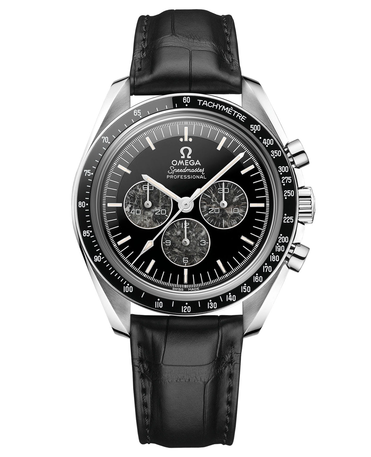 , а винтажный логотип OMEGA повторяет этот благородный материал. Особый акцент — три субциферблата из лунного метеорита, впервые использованные в коллекции Apollo 11 50th Anniversary.
