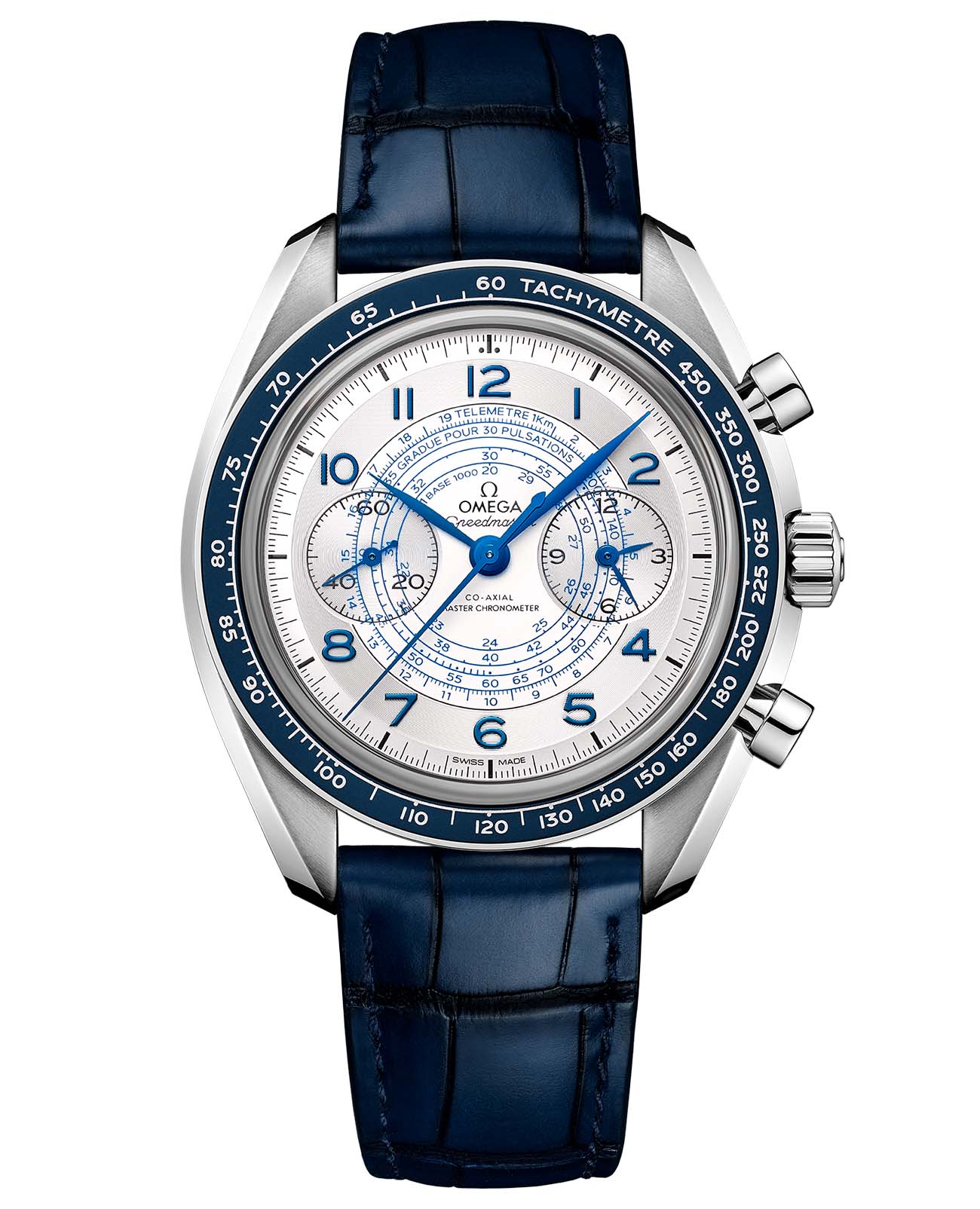 Chronoscope возрождает дух винтажных хронографов 1940-х, переосмысливая их через призму культового стиля Speedmaster. 43-мм корпус из нержавеющей стали с синим безелемБезельВнешний ободок, закрепляющий стекло. В спортивных часах так называется поворотное кольцо с делениями на циферблате, выполняет роль таймера – замеряет отрезки времени на шкале. Неподвижный безель – элемент декора. Однонаправленно вращающийся безель на дайверских часах позволяет фиксировать моменты погружения и выныривания на поверхность. из анодированного алюминия обрамляет серебристый циферблат, украшенный спиралевидным узором. Синие стрелки в форме листьев и арабские цифры создают элегантный контраст, а три исторические шкалы в форме улитки - тахиметрическая, пульсометрическая и телеметрическая - добавляют функциональности. Часы дополнены синим кожаным ремешком, подчеркивая их винтажный характер, а калибр OMEGA Co-Axial Master Chronometer 9908 обеспечивает безупречную точность, соединяя традиции с современными технологиями. На позиции "9 часов" расположен секундный счетчик, в то время как на "3 часах" удобно разместились 60-минутный и 12-часовой индикаторы.