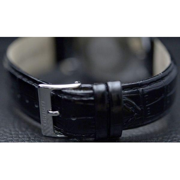 Минималистичный циферблат дополнен стильным узором. Модель оснащена японским автоматическим калибром Orient 46Е40 с запасом хода до 40 часов, противоударное устройство оси баланса обеспечивает лучшую защиту. Ремешок из натуральной кожи имеет рисунок под крокодиловую кожу. Стрелки и метки дополнены люминесцентной подсветкойЛюминесцентное покрытиеПозволяет считывать показания времени в темноте. Производители наносят на стрелки, часовые индексы, безель или поверхность циферблата светонакопительный состав, дающий холодное свечение.. Функции: отображение числа, дня недели.