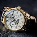 Наручные часы являются отражением винтажного стиля, гильошированный белый циферблат дополнен тонкими римскими цифрами, изысканности придаёт классический чёрный ремешок из натуральной кожи. Уникальность модели в нижнем окошке с изображением луны и солнца, так дизайнеры красиво преподносят нам смену дня и ночи. Кварцевый высокоточный калибр Orient KUE00. Сапфировое стекло. Водозащита до 5 бар. Корпус из хирургической стали 316L с цветным PVD-финишемPVDУльтратонкое покрытие наносится в технике вакуумного напыления, сочетает в себе нитрид титана особой прочности со слоем золота или оксида хрома. Несёт в себе декоративную или защитную функцию. золотистого оттенка. Отображение числа и дня недели. Диаметр корпуса: 43,8 мм.