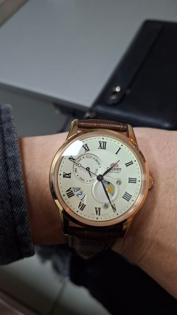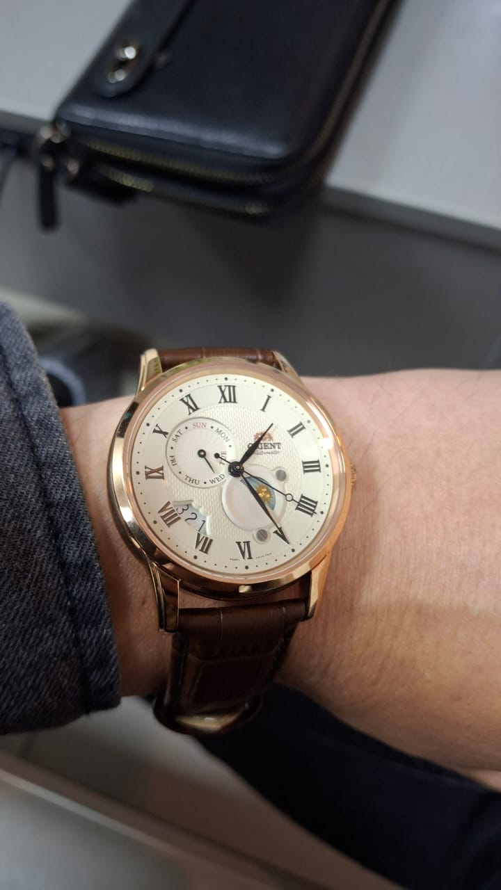 Часы Orient RA-AK0007S из коллекции Sun and Moon — это утончённое сочетание классического дизайна и функциональности. Корпус диаметром 42,5 мм выполнен из нержавеющей стали с элегантным PVD-покрытиемPVDУльтратонкое покрытие наносится в технике вакуумного напыления, сочетает в себе нитрид титана особой прочности со слоем золота или оксида хрома. Несёт в себе декоративную или защитную функцию. розового золота, что подчёркивает изысканность модели. Изысканный кремовый циферблат украшен чёрными римскими цифрами и стрелками, а отображает смену времени суток, добавляя часам уникальности. Отдельные указатели дня недели и даты на циферблате подчёркивают практичность модели. Сапфировое стеклоСапфировое стеклоПрочный и надёжный материал из кристалла сапфира синтетического происхождения, характеризующийся особой твёрдостью и устойчивостью к царапинам и повреждениям. с выпуклой формой защищает циферблат от царапин. Автоматический механизм Orient Calibre F6B24 поддерживает ручной завод и функцию остановки секундной стрелки, обеспечивая точность хода. Запас хода составляет около 40 часов, что делает часы надёжными в повседневной жизни. Коричневый кожаный ремешок с тиснением под крокодила и раскладной застёжкой-бабочкойЗастёжка "бабочка"Такой вид застёжки дополняется предохранителями, помогающими избежать случайного раскрытия браслета. Обладают изящным исполнением. обеспечивает комфортное ношение и надёжную фиксацию. Водонепроницаемость до 50 метров защищает часы от случайных брызг. Orient RA-AK0007S — это идеальный аксессуар для тех, кто ценит стиль, функциональность и традиции часового искусства.