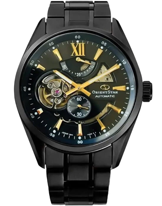 Часы Orient Star RE-AV0129B — это стильное сочетание современного дизайна и часового мастерства. Корпус из нержавеющей стали с PVD-покрытиемPVDУльтратонкое покрытие наносится в технике вакуумного напыления, сочетает в себе нитрид титана особой прочности со слоем золота или оксида хрома. Несёт в себе декоративную или защитную функцию. диаметром 41 мм защищён сапфировым стекломСапфировое стеклоПрочный и надёжный материал из кристалла сапфира синтетического происхождения, характеризующийся особой твёрдостью и устойчивостью к царапинам и повреждениям. с антибликовым покрытиемАнтибликовое покрытиеСлой оксида металла в 0,13-0,3 микрон, благодаря которому стекло часов не бликует и не отражает свет. Антибликовое покрытие уменьшает отражение света в 10 раз, обеспечивая отличную читаемость показателей циферблата., что обеспечивает отличную видимость и защиту от царапин. Черный циферблат с открытыми элементами позволяет наблюдать за изысканной работой механизма. Люминесцентные стрелки и меткиЛюминесцентное покрытиеПозволяет считывать показания времени в темноте. Производители наносят на стрелки, часовые индексы, безель или поверхность циферблата светонакопительный состав, дающий холодное свечение. обеспечивают превосходную читаемость даже в условиях низкой освещённости. Внутри установлен автоматический механизм Orient Calibre F6F44, который обеспечивает точность хода и запас хода до 50 часов. Индикатор запаса хода на отметке «12 часов» добавляют функциональности и эстетического удовольствия. Браслет из нержавеющей стали с PVD-покрытиемPVDУльтратонкое покрытие наносится в технике вакуумного напыления, сочетает в себе нитрид титана особой прочности со слоем золота или оксида хрома. Несёт в себе декоративную или защитную функцию. оснащён раскладной застёжкойРаскладная застёжкаТакой тип застёжки используется только на браслетах из металла. Она никогда не раскрывается полностью, происходит разделение на 2 и более частей. Раскладывающая застёжка снизит вероятность потери часов к минимуму., что обеспечивает удобство и надёжность. Водонепроницаемость до 100 метров делает часы подходящими для плавания и активного использования. Orient Star RE-AV0129B — это выбор для тех, кто ценит утончённость, стиль и высочайшее качество.