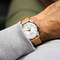 Многокомпонентный корпус из нержавеющей стали. Сапфировое стеклоСапфировое стеклоПрочный и надёжный материал из кристалла сапфира синтетического происхождения, характеризующийся особой твёрдостью и устойчивостью к царапинам и повреждениям., выпуклое с обеих сторон, внутреннее антибликовое покрытие. Нержавеющая сталь, завинчивающаяся прозрачная задняя крышка из минерального стеклаМинеральное стеклоМинеральное стекло представляет собой искусственно выращенный минерал кварца. Такое стекло отличается особой устойчивостью к повреждениям и царапинам. Уступает по некоторым качествам сапфировому стеклу.. Стрелки с люминесцентным покрытиемЛюминесцентное покрытиеПозволяет считывать показания времени в темноте. Производители наносят на стрелки, часовые индексы, безель или поверхность циферблата светонакопительный состав, дающий холодное свечение.. Кожаный ремень.