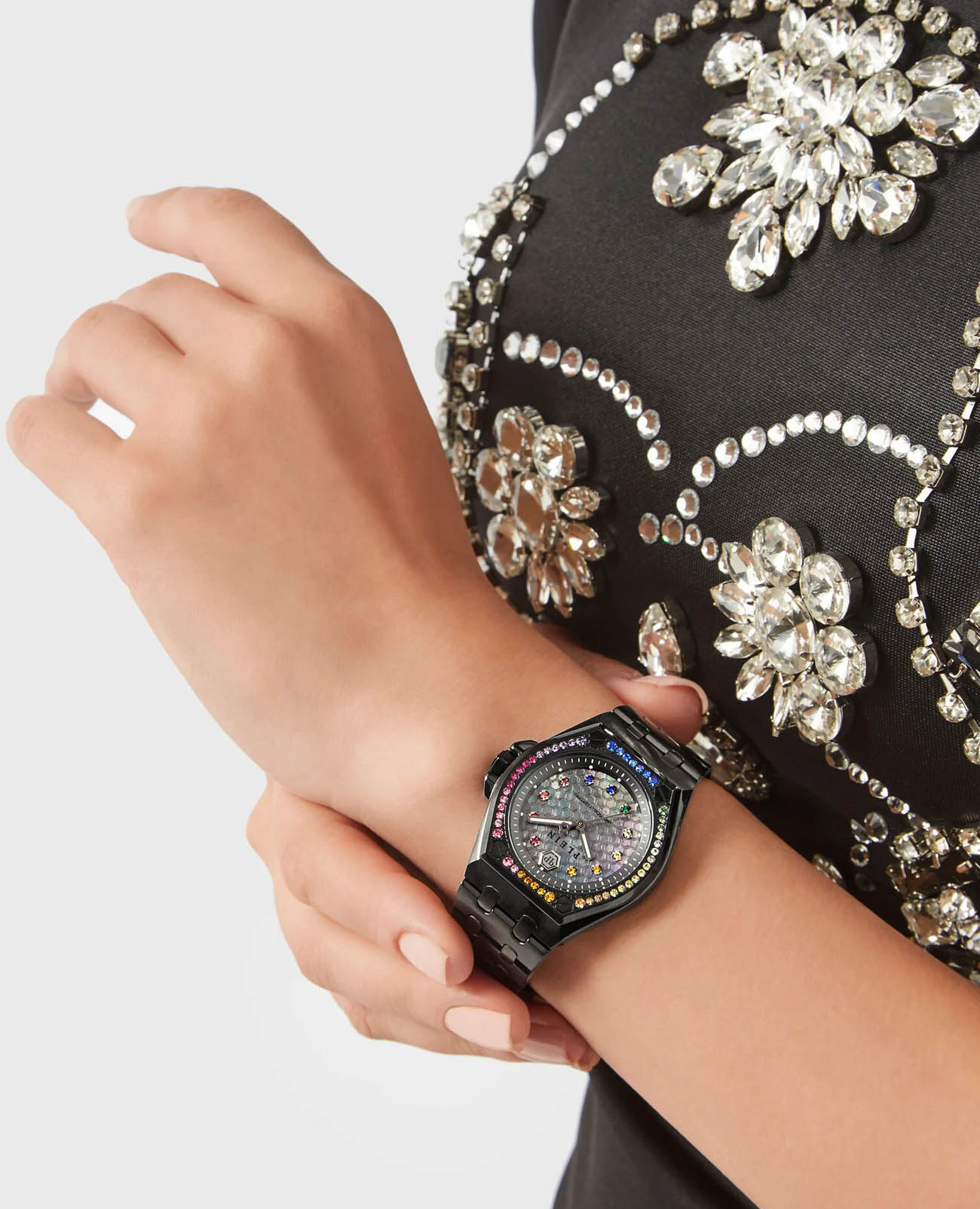 Женкие кварцевые часы Philipp Plein Extreme PWJAA1423. Корпус и браслет часов изготовлены из нержавеющей стали с IP-покрытиемIP-покрытиеМетод ионного напыления. Демонстрирует повышенную устойчивость к истиранию, окислению и химическим веществам. Под воздействием высокого давления и температуры около 1500°C молекулы металла надёжно соединяются с частицами корпуса часов. . Минеральное стеклоМинеральное стеклоМинеральное стекло представляет собой искусственно выращенный минерал кварца. Такое стекло отличается особой устойчивостью к повреждениям и царапинам. Уступает по некоторым качествам сапфировому стеклу. устойчивое к мелким механическим повреждениям. Стальной браслет на застёжке-бабочке с кнопкамиЗастёжка "бабочка"Такой вид застёжки дополняется предохранителями, помогающими избежать случайного раскрытия браслета. Обладают изящным исполнением. . Влагозащита: 50 метров, позволит защитить корпус от случайных брызг или капель дождя. Стрелки и метки с люминесцентным покрытиемЛюминесцентное покрытиеПозволяет считывать показания времени в темноте. Производители наносят на стрелки, часовые индексы, безель или поверхность циферблата светонакопительный состав, дающий холодное свечение.. Практичный ремешок из силикона на стандартной застёжке. БезельБезельВнешний ободок, закрепляющий стекло. В спортивных часах так называется поворотное кольцо с делениями на циферблате, выполняет роль таймера – замеряет отрезки времени на шкале. Неподвижный безель – элемент декора. Однонаправленно вращающийся безель на дайверских часах позволяет фиксировать моменты погружения и выныривания на поверхность. и циферблат инкрустированы цветными кристаллами Preciosa.
