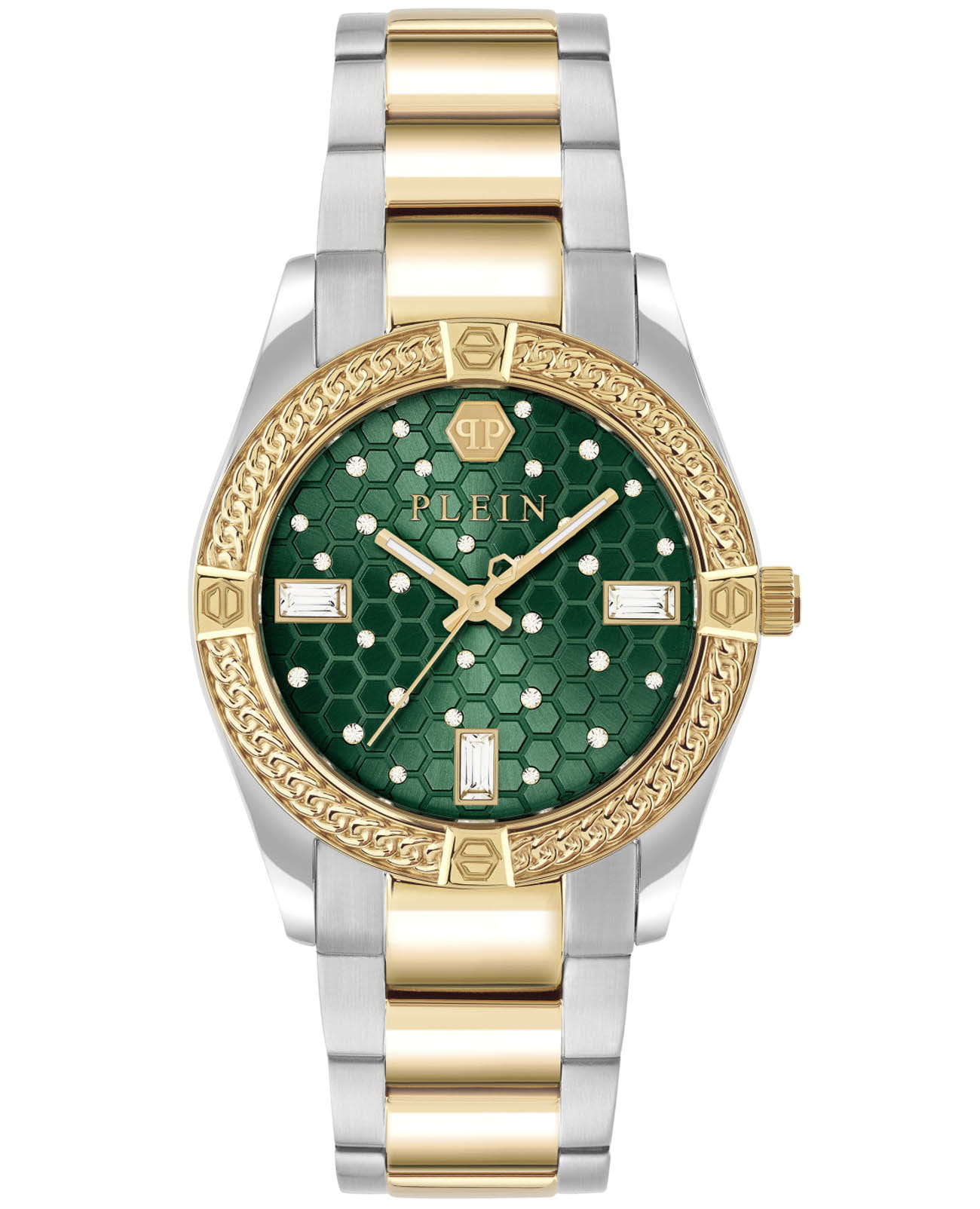 Женские кварцевые часы Philipp Plein Plein Icon Chain PW1FA0325 — это стильное сочетание элегантности и современного дизайна. Изящный корпус выполнен из нержавеющей стали, диаметром 36 мм, что придаст образу женственности и романтизма. Изысканный циферблат с метками в виде штрихов придает модели особый блеск. Циферблат защищен минеральным стекломМинеральное стеклоМинеральное стекло представляет собой искусственно выращенный минерал кварца. Такое стекло отличается особой устойчивостью к повреждениям и царапинам. Уступает по некоторым качествам сапфировому стеклу., обеспечивающий устойчивость к царапинам и украшен кристаллами. Стрелки с люминесцентным покрытиемЛюминесцентное покрытиеПозволяет считывать показания времени в темноте. Производители наносят на стрелки, часовые индексы, безель или поверхность циферблата светонакопительный состав, дающий холодное свечение.. БезельБезельВнешний ободок, закрепляющий стекло. В спортивных часах так называется поворотное кольцо с делениями на циферблате, выполняет роль таймера – замеряет отрезки времени на шкале. Неподвижный безель – элемент декора. Однонаправленно вращающийся безель на дайверских часах позволяет фиксировать моменты погружения и выныривания на поверхность. с PVD-покрытиемPVDУльтратонкое покрытие наносится в технике вакуумного напыления, сочетает в себе нитрид титана особой прочности со слоем золота или оксида хрома. Несёт в себе декоративную или защитную функцию. золотистого цвета. Часы оснащены надежным кварцевым механизмом. Стальной браслет с частичным PVD-покрытиемPVDУльтратонкое покрытие наносится в технике вакуумного напыления, сочетает в себе нитрид титана особой прочности со слоем золота или оксида хрома. Несёт в себе декоративную или защитную функцию. на застёжке-бабочкеЗастёжка "бабочка"Такой вид застёжки дополняется предохранителями, помогающими избежать случайного раскрытия браслета. Обладают изящным исполнением. , гарантирует комфортное и безопасное ношение. Класс водозащиты: 50 метров позволит защитить корпус от случайных брызг или капель дождя. Phlipp Plein — отличный выбор для тех, кто ценит яркость и качество.