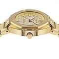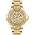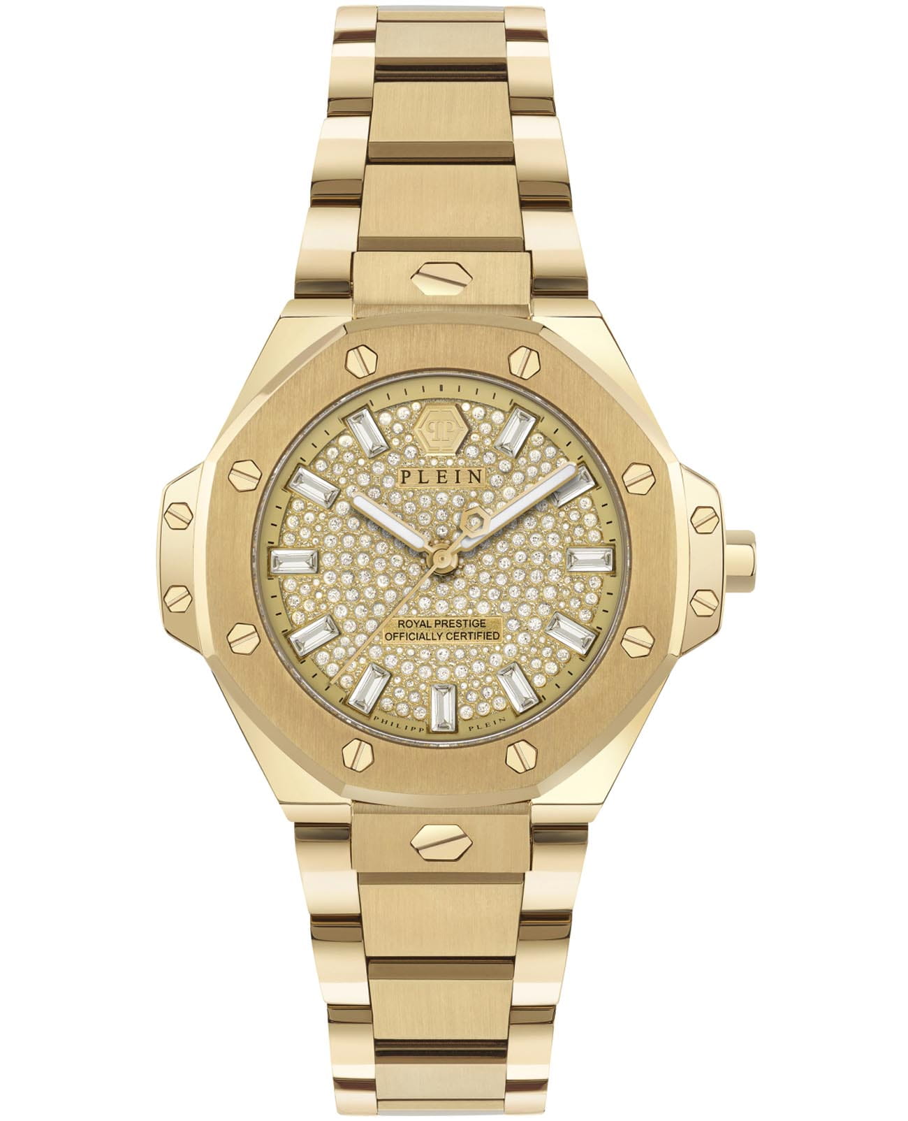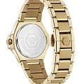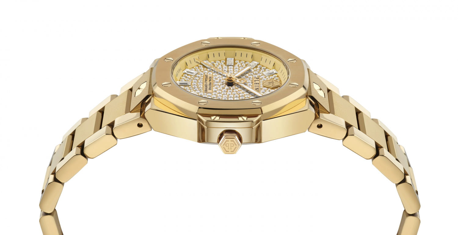 Женские кварцевые часы Philipp Plein Plein Royal Prestige PW4FA0525 — это стильное сочетание элегантности и современного дизайна. Изящный корпус выполнен из нержавеющей стали с PVD-покрытиемPVDУльтратонкое покрытие наносится в технике вакуумного напыления, сочетает в себе нитрид титана особой прочности со слоем золота или оксида хрома. Несёт в себе декоративную или защитную функцию. золотистого цвета, диаметром 33 мм, что придаст образу женственности и романтизма. Изысканный циферблат с метками в виде штрихов придает модели особый блеск. Циферблат защищен минеральным стекломМинеральное стеклоМинеральное стекло представляет собой искусственно выращенный минерал кварца. Такое стекло отличается особой устойчивостью к повреждениям и царапинам. Уступает по некоторым качествам сапфировому стеклу., обеспечивающий устойчивость к царапинам. БезельБезельВнешний ободок, закрепляющий стекло. В спортивных часах так называется поворотное кольцо с делениями на циферблате, выполняет роль таймера – замеряет отрезки времени на шкале. Неподвижный безель – элемент декора. Однонаправленно вращающийся безель на дайверских часах позволяет фиксировать моменты погружения и выныривания на поверхность. украшен винтами, а циферблат украшен кристаллами. Стрелки с люминесцентным покрытиемЛюминесцентное покрытиеПозволяет считывать показания времени в темноте. Производители наносят на стрелки, часовые индексы, безель или поверхность циферблата светонакопительный состав, дающий холодное свечение.. Часы оснащены надежным кварцевым механизмом. Стальной браслет с PVD-покрытиемPVDУльтратонкое покрытие наносится в технике вакуумного напыления, сочетает в себе нитрид титана особой прочности со слоем золота или оксида хрома. Несёт в себе декоративную или защитную функцию. на застёжке-бабочке с кнопкамиЗастёжка "бабочка"Такой вид застёжки дополняется предохранителями, помогающими избежать случайного раскрытия браслета. Обладают изящным исполнением. , гарантирует комфортное и безопасное ношение. Класс водозащиты: 50 метров позволит защитить корпус от случайных брызг или капель дождя. Phlipp Plein — отличный выбор для тех, кто ценит яркость и качество.