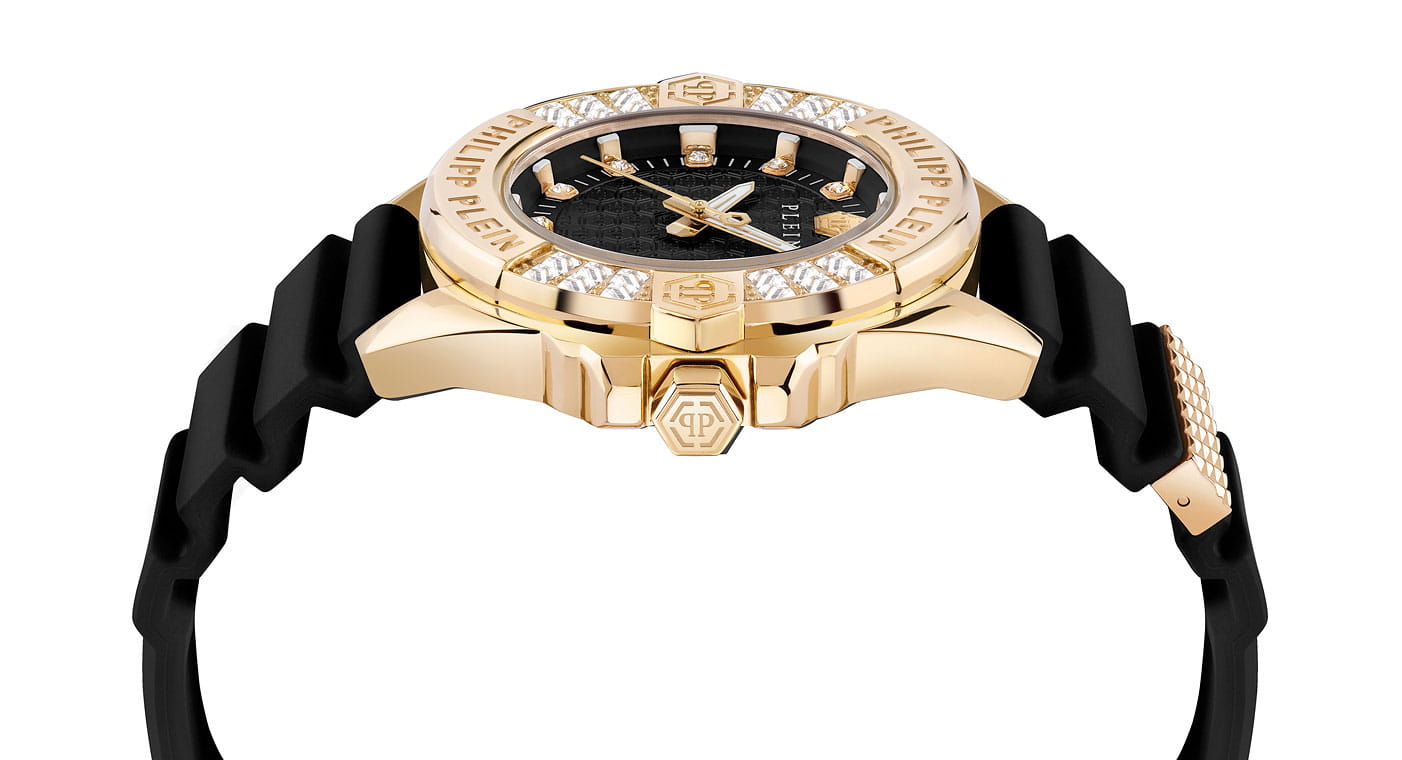 Philipp Plein Plein Majesty PWOFA0225 - дерзкое заявление любви к роскоши и бунтарскому стилю. Диаметр круглого корпуса из прочной нержавеющей стали с PVD-покрытиемPVDУльтратонкое покрытие наносится в технике вакуумного напыления, сочетает в себе нитрид титана особой прочности со слоем золота или оксида хрома. Несёт в себе декоративную или защитную функцию. равен 38 мм. Силиконовый ремешок на стандартной застёжке обеспечивает надёжную фиксацию и комфортное ношение. Метки в виде кристаллов Preciosa. Минеральное стеклоМинеральное стеклоМинеральное стекло представляет собой искусственно выращенный минерал кварца. Такое стекло отличается особой устойчивостью к повреждениям и царапинам. Уступает по некоторым качествам сапфировому стеклу. защищает циферблат от царапин. Люминесцентное покрытиеЛюминесцентное покрытиеПозволяет считывать показания времени в темноте. Производители наносят на стрелки, часовые индексы, безель или поверхность циферблата светонакопительный состав, дающий холодное свечение. стрелок и меток позволит следить за временем даже в полной темноте. БезельБезельВнешний ободок, закрепляющий стекло. В спортивных часах так называется поворотное кольцо с делениями на циферблате, выполняет роль таймера – замеряет отрезки времени на шкале. Неподвижный безель – элемент декора. Однонаправленно вращающийся безель на дайверских часах позволяет фиксировать моменты погружения и выныривания на поверхность. инкрустирован кристаллами. Влагозащита: 50 метров, позволит защитить корпус от случайных брызг или капель дождя. Идеальный аксессуар для тех, кто ценит индивидуальность и не боится выделяться из толпы.