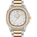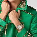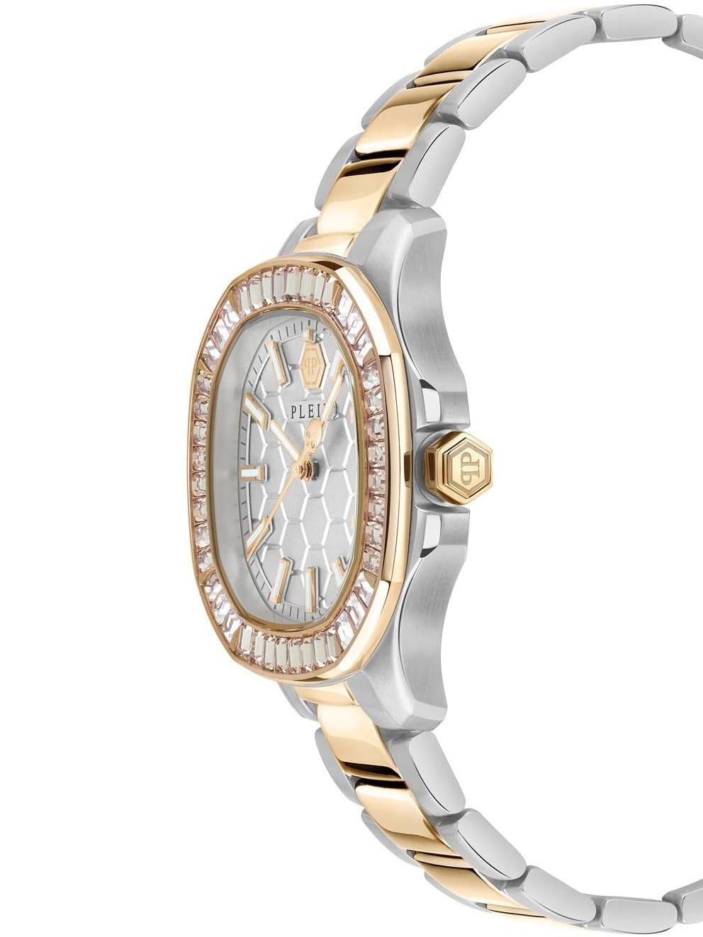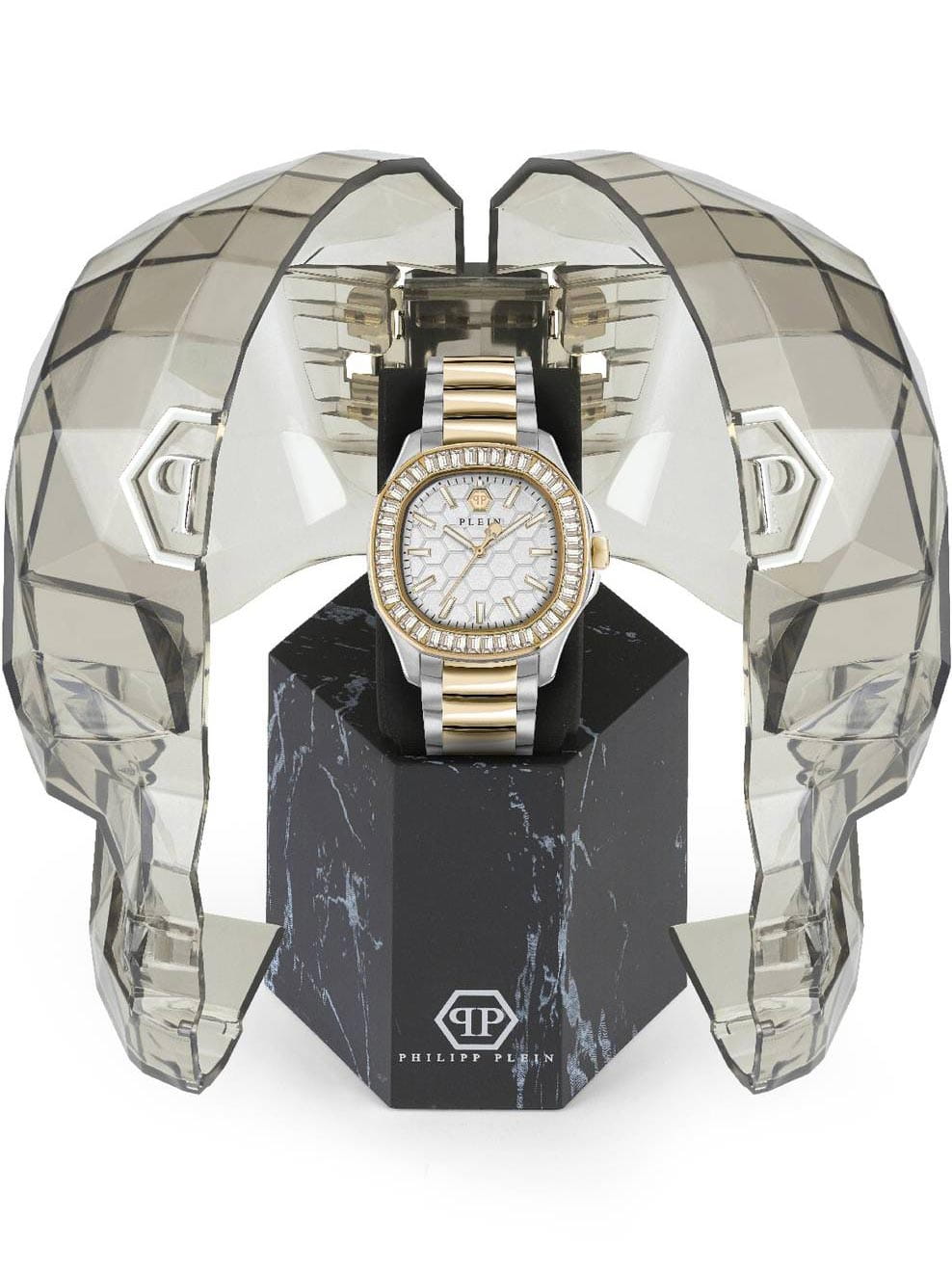 Яркие женские часы с минеральным стекломМинеральное стеклоМинеральное стекло представляет собой искусственно выращенный минерал кварца. Такое стекло отличается особой устойчивостью к повреждениям и царапинам. Уступает по некоторым качествам сапфировому стеклу. Philipp Plein PWTAA0523, кварцевый механизм с высокой точностью. Класс водозащиты: 50 метров, позволит защитить корпус от случайных брызг или капель дождя. Корпус часов изготовлен из стали с IP-покрытиемIP-покрытиеМетод ионного напыления. Демонстрирует повышенную устойчивость к истиранию, окислению и химическим веществам. Под воздействием высокого давления и температуры около 1500°C молекулы металла надёжно соединяются с частицами корпуса часов.. Стрелки и метки с люминесцентным покрытиемЛюминесцентное покрытиеПозволяет считывать показания времени в темноте. Производители наносят на стрелки, часовые индексы, безель или поверхность циферблата светонакопительный состав, дающий холодное свечение.. Стальной корпус с геометричным безелем, инкрустированным кристаллами. Застёжка бабочка с кнопкамиЗастёжка "бабочка"Такой вид застёжки дополняется предохранителями, помогающими избежать случайного раскрытия браслета. Обладают изящным исполнением.
