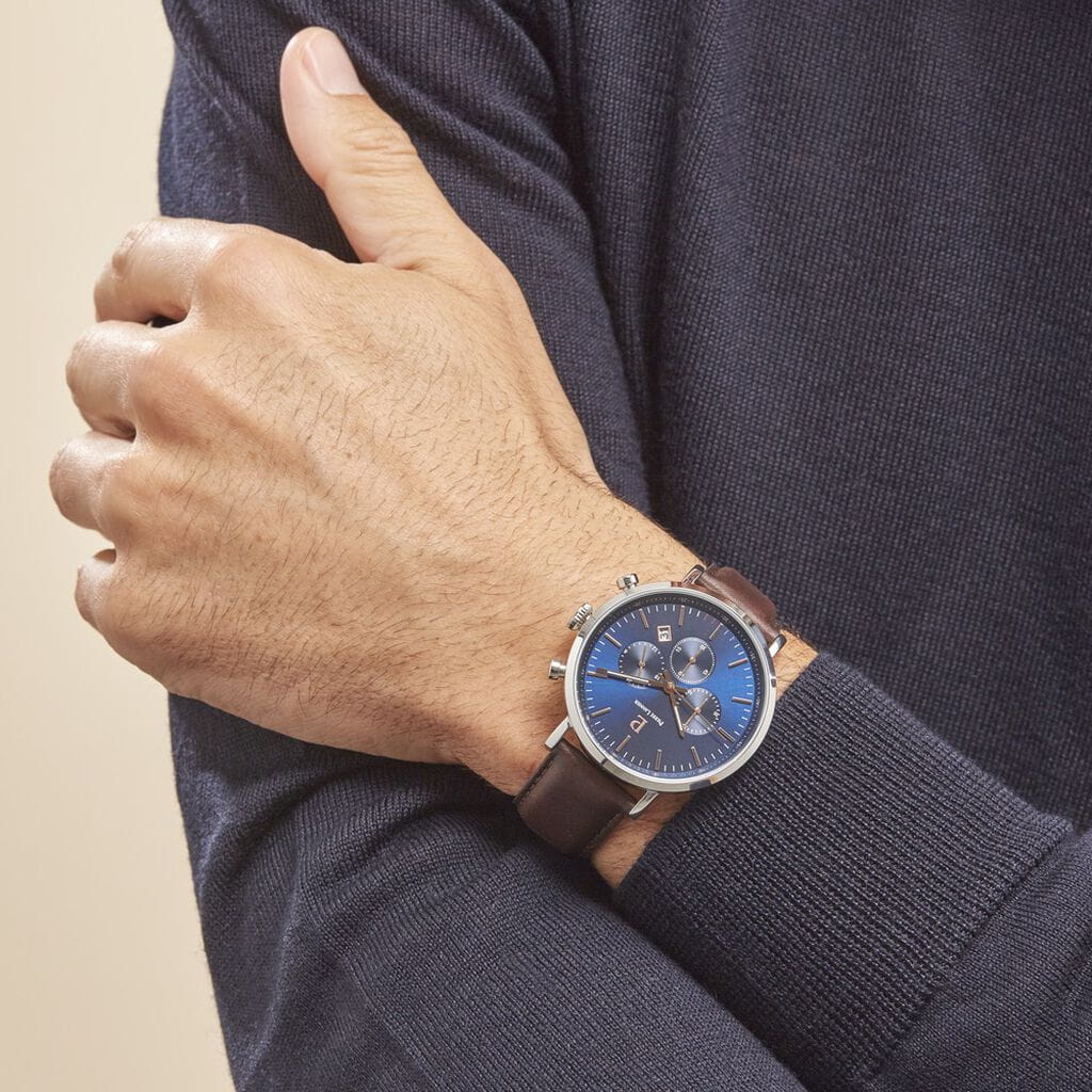 Мужские кварцевые часы Pierre Lannier Baron 221F164. Часы хронографХронографФункция позволяет измерять отрезки времени с особой точностью: часы, минуты, секунды. Верным признаком хронографа является наличие на циферблате 3 дополнительных окошек-счётчиков. с секундомеромСекундомерСекундоме́р — прибор, способный измерять интервалы времени с точностью до долей секунды.. Минеральное стеклоМинеральное стеклоМинеральное стекло представляет собой искусственно выращенный минерал кварца. Такое стекло отличается особой устойчивостью к повреждениям и царапинам. Уступает по некоторым качествам сапфировому стеклу. устойчивое к мелким механическим повреждениям. Центральные часовая и минутная стрелки, секундная стрелка вынесена на малый циферблат. Окошко даты между 4 и 5 часам. Корпус выполнен из нержавеющей стали. Стрелки с люминесцентным покрытиемЛюминесцентное покрытиеПозволяет считывать показания времени в темноте. Производители наносят на стрелки, часовые индексы, безель или поверхность циферблата светонакопительный состав, дающий холодное свечение.. Водостойкость: 50 метров, позволит защитить корпус от случайных брызг или капель дождя. Кожаный ремешок на стандартной застёжке.