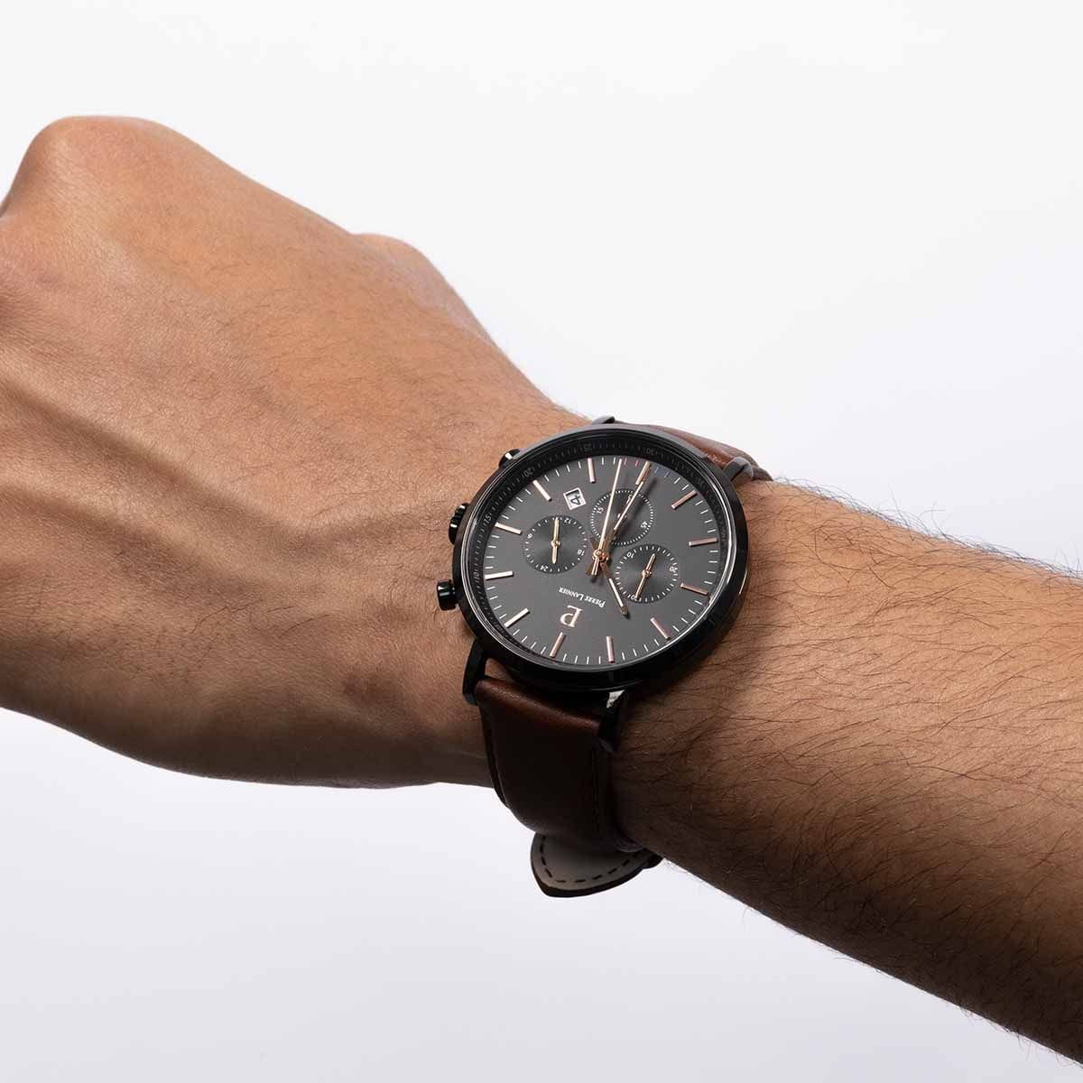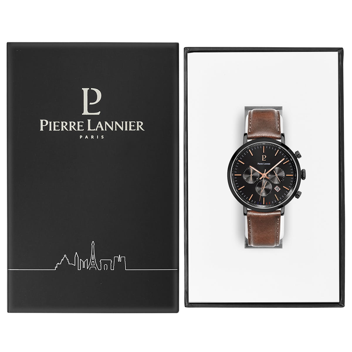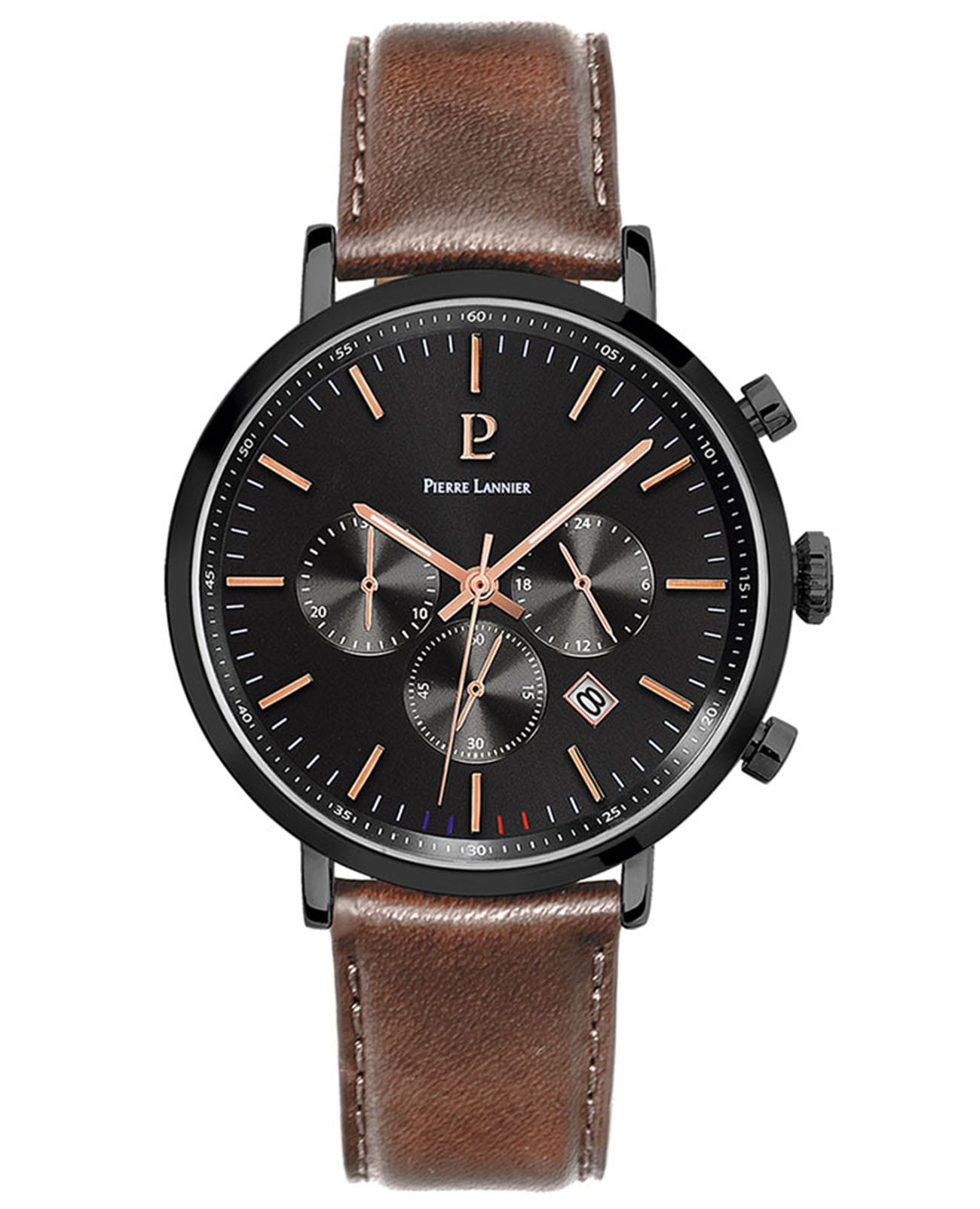 Мужские кварцевые часы Pierre Lannier Baron 222G434. Часы хронографХронографФункция позволяет измерять отрезки времени с особой точностью: часы, минуты, секунды. Верным признаком хронографа является наличие на циферблате 3 дополнительных окошек-счётчиков. с секундомеромСекундомерСекундоме́р — прибор, способный измерять интервалы времени с точностью до долей секунды.. Минеральное стеклоМинеральное стеклоМинеральное стекло представляет собой искусственно выращенный минерал кварца. Такое стекло отличается особой устойчивостью к повреждениям и царапинам. Уступает по некоторым качествам сапфировому стеклу. устойчивое к мелким механическим повреждениям. Центральные часовая и минутная стрелки, секундная стрелка вынесена на малый циферблат. Окошко даты между 4 и 5 часам. Корпус и неподвижный безельБезельВнешний ободок, закрепляющий стекло. В спортивных часах так называется поворотное кольцо с делениями на циферблате, выполняет роль таймера – замеряет отрезки времени на шкале. Неподвижный безель – элемент декора. Однонаправленно вращающийся безель на дайверских часах позволяет фиксировать моменты погружения и выныривания на поверхность. из нержавеющей стали с IP-покрытиемIP-покрытиеМетод ионного напыления. Демонстрирует повышенную устойчивость к истиранию, окислению и химическим веществам. Под воздействием высокого давления и температуры около 1500°C молекулы металла надёжно соединяются с частицами корпуса часов.. Стрелки с люминесцентным покрытиемЛюминесцентное покрытиеПозволяет считывать показания времени в темноте. Производители наносят на стрелки, часовые индексы, безель или поверхность циферблата светонакопительный состав, дающий холодное свечение.. Водостойкость: 50 метров, позволит защитить корпус от случайных брызг или капель дождя. Кожаный ремешок на стандартной застёжке.