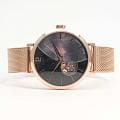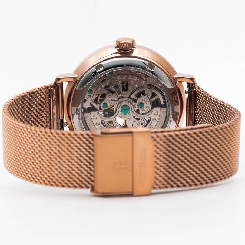 Браслет «миланская сетка» из стали с IP-покрытием подчёркивает утончённый, плотно облегающий дизайн. Он закреплён удобным раскладным замкомРаскладной замокДанный вариант застежки используется только на часах с металлическим браслетом. Отличительная особенность такого крепления в том, что длина браслета становится универсальной и вы можете самостоятельно отрегулировать нужный вам размер – застежка просто двигается по браслету часов.— надёжно и изящно.