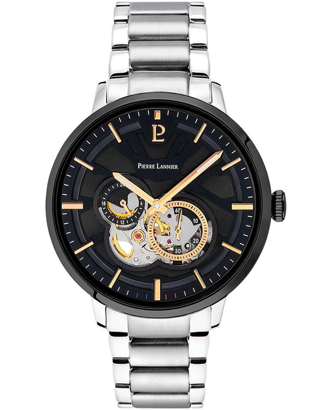 Мужские механические часы с автоподзаводом Pierre Lannier Trio 331H131. Минеральное стеклоМинеральное стеклоМинеральное стекло представляет собой искусственно выращенный минерал кварца. Такое стекло отличается особой устойчивостью к повреждениям и царапинам. Уступает по некоторым качествам сапфировому стеклу. устойчивое к мелким механическим повреждениям. Центральные часовая и минутная стрелки, секундная стрелка вынесена в малый циферблат. 12/24х часовой формат времени. Черный скелетонизированный циферблат. Корпус выполнен из нержавеющей стали с IP-покрытиемIP-покрытиеМетод ионного напыления. Демонстрирует повышенную устойчивость к истиранию, окислению и химическим веществам. Под воздействием высокого давления и температуры около 1500°C молекулы металла надёжно соединяются с частицами корпуса часов.. Водостойкость: 50 метров, позволит защитить корпус от случайных брызг или капель дождя. Стальной браслет на раскладной застёжкеРаскладная застёжкаТакой тип застёжки используется только на браслетах из металла. Она никогда не раскрывается полностью, происходит разделение на 2 и более частей. Раскладывающая застёжка снизит вероятность потери часов к минимуму.. Стрелки с люминесцентным покрытиемЛюминесцентное покрытиеПозволяет считывать показания времени в темноте. Производители наносят на стрелки, часовые индексы, безель или поверхность циферблата светонакопительный состав, дающий холодное свечение.. Диаметр корпуса составляет 42 мм, толщина 13,55 мм.
