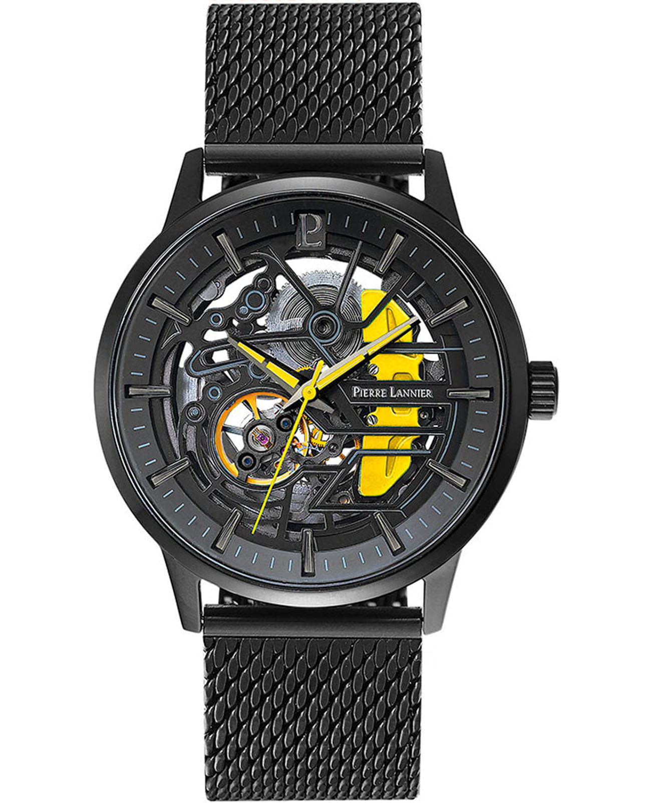 Мужские механические часы с автоподзаводом Pierre Lannier Paddock 338A439. Минеральное стеклоМинеральное стеклоМинеральное стекло представляет собой искусственно выращенный минерал кварца. Такое стекло отличается особой устойчивостью к повреждениям и царапинам. Уступает по некоторым качествам сапфировому стеклу. устойчивое к мелким механическим повреждениям. Центральные часовая, минутная и секундная стрелки. Корпус выполнен из нержавеющей стали с IP-покрытиемIP-покрытиеМетод ионного напыления. Демонстрирует повышенную устойчивость к истиранию, окислению и химическим веществам. Под воздействием высокого давления и температуры около 1500°C молекулы металла надёжно соединяются с частицами корпуса часов.. Водостойкость: 50 метров, позволит защитить корпус от случайных брызг или капель дождя. Стальной браслет миланского плетения с раскладной застёжкойРаскладная застёжкаТакой тип застёжки используется только на браслетах из металла. Она никогда не раскрывается полностью, происходит разделение на 2 и более частей. Раскладывающая застёжка снизит вероятность потери часов к минимуму.. Черный скелетонизированный циферблат.