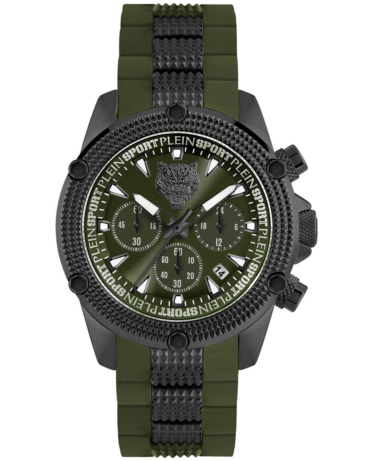 Немецкие кварцевые унисекс часы-хронографХронографФункция позволяет измерять отрезки времени с особой точностью: часы, минуты, секунды. Верным признаком хронографа является наличие на циферблате 3 дополнительных окошек-счётчиков. с секундомеромСекундомерСекундоме́р — прибор, способный измерять интервалы времени с точностью до долей секунды. Plein Sport Hurricane PSDBA0223, кварцевый механизм с высокой точностью. Класс водозащиты: 50 метров, позволит защитить корпус от случайных брызг или капель дождя. Корпус выполнен из стали с IP-покрытиемIP-покрытиеМетод ионного напыления. Демонстрирует повышенную устойчивость к истиранию, окислению и химическим веществам. Под воздействием высокого давления и температуры около 1500°C молекулы металла надёжно соединяются с частицами корпуса часов.. Стрелки и метки с люминесцентным покрытиемЛюминесцентное покрытиеПозволяет считывать показания времени в темноте. Производители наносят на стрелки, часовые индексы, безель или поверхность циферблата светонакопительный состав, дающий холодное свечение.. Силиконовый браслет на стандартной застежке. Минеральное стеклоМинеральное стеклоМинеральное стекло представляет собой искусственно выращенный минерал кварца. Такое стекло отличается особой устойчивостью к повреждениям и царапинам. Уступает по некоторым качествам сапфировому стеклу. устойчивое к мелким механическим повреждениям. Окошко даты находится в положении между 4 и 5 часов.