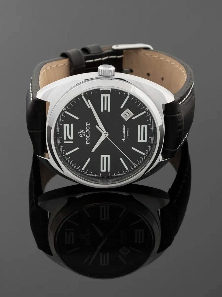 Poljot 8215.241270 — элегантные механические часы с автоподзаводом, сочетающем силу и изысканность. Корпус из нержавеющей стали подчеркивает надёжность и лаконичность дизайна, а глубокий циферблат с серебристыми стрелками и крупными арабскими цифрами придаёт модели благородный акцент. Проверенный японский механизм Miyota 8215 обеспечивает точность хода и долговечность, а плавное движение секундной стрелки подчёркивает качество сборки. Метки и стрелки с люминесцентным покрытиемЛюминесцентное покрытиеПозволяет считывать показания времени в темноте. Производители наносят на стрелки, часовые индексы, безель или поверхность циферблата светонакопительный состав, дающий холодное свечение. обеспечивают отличную читаемость при любом освещении, а окно даты добавляет практичности. Прочное минеральное стеклоМинеральное стеклоМинеральное стекло представляет собой искусственно выращенный минерал кварца. Такое стекло отличается особой устойчивостью к повреждениям и царапинам. Уступает по некоторым качествам сапфировому стеклу. защищает циферблат от царапин, а ремешок из натуральной кожи в тон циферблату завершает утончённый облик модели. Poljot — гармония классики и современной механики, созданная для тех, кто ценит традиции и индивидуальность в каждой детали. В комплекте дополнительный ремешок с напульсником.