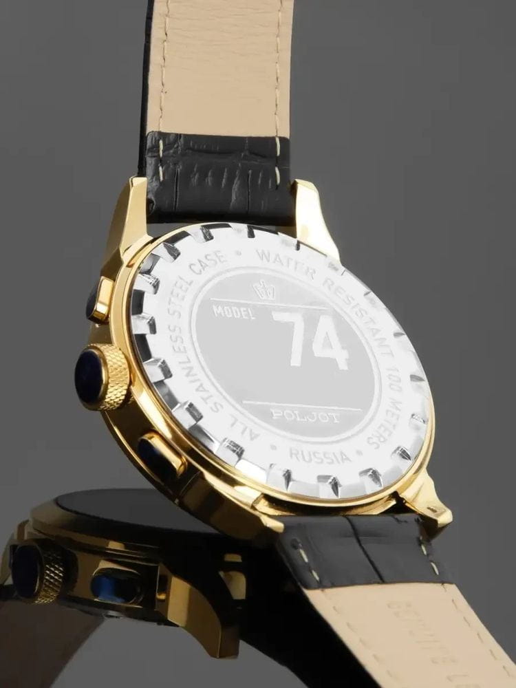 Poljot 6S21.746033 — классические мужские часы, в которых традиции российского часового мастерства сочетаются с современным дизайном. Корпус из нержавеющей стали с PVD-покрытиемPVDУльтратонкое покрытие наносится в технике вакуумного напыления, сочетает в себе нитрид титана особой прочности со слоем золота или оксида хрома. Несёт в себе декоративную или защитную функцию. подчёркивает солидность и надёжность модели, а насыщенный циферблат с лучевой текстурой придаёт образу выразительность и глубину. Два дополнительных счётчика хронографаХронографФункция позволяет измерять отрезки времени с особой точностью: часы, минуты, секунды. Верным признаком хронографа является наличие на циферблате 3 дополнительных окошек-счётчиков. обеспечивают точное измерение интервалов времени, дополняя функциональность часов. Контрастные стрелки и метки с люминесцентным покрытиемЛюминесцентное покрытиеПозволяет считывать показания времени в темноте. Производители наносят на стрелки, часовые индексы, безель или поверхность циферблата светонакопительный состав, дающий холодное свечение. обеспечивают отличную читаемость даже в условиях слабого освещения. Прочное минеральное стеклоМинеральное стеклоМинеральное стекло представляет собой искусственно выращенный минерал кварца. Такое стекло отличается особой устойчивостью к повреждениям и царапинам. Уступает по некоторым качествам сапфировому стеклу. защищает циферблат от царапин, а ремешок из натуральной кожи с классической пряжкой гарантирует комфорт и элегантную посадку на запястье. Poljot — это надёжный спутник современного мужчины, объединяющий точность, стиль и характер.