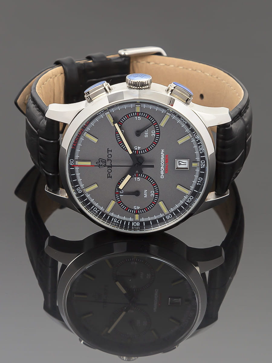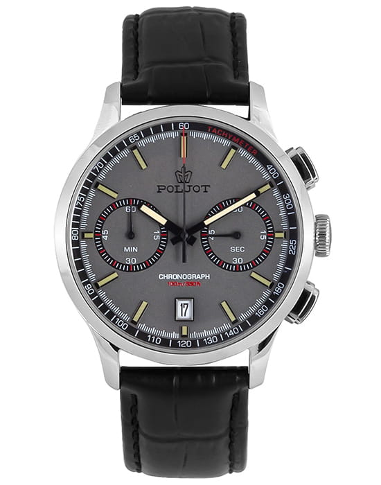 Poljot 6S21.901213 — современные мужские часы с выразительным спортивным дизайном и надёжной функциональностью. Корпус из нержавеющей стали подчёркивает прочность и уверенный характер модели, а глубокий циферблат с счётчиками хронографаХронографФункция позволяет измерять отрезки времени с особой точностью: часы, минуты, секунды. Верным признаком хронографа является наличие на циферблате 3 дополнительных окошек-счётчиков. и аккуратным окном даты на позиции «6 часов» придаёт часам динамичный вид. Контрастные стрелки и метки с люминесцентным покрытиемЛюминесцентное покрытиеПозволяет считывать показания времени в темноте. Производители наносят на стрелки, часовые индексы, безель или поверхность циферблата светонакопительный состав, дающий холодное свечение. обеспечивают удобство считывания информации в любое время суток, а внешняя шкала тахиметраТахиметрРазмеченная шкала, располагается на ободке или безеле часов. Тахиметр позволяет рассчитать скорость на определённом участке пути, расстояние измеряется в километрах или милях. добавляет спортивную функциональность. Прочное минеральное стеклоМинеральное стеклоМинеральное стекло представляет собой искусственно выращенный минерал кварца. Такое стекло отличается особой устойчивостью к повреждениям и царапинам. Уступает по некоторым качествам сапфировому стеклу. защищает циферблат от царапин, а ремешок из натуральной кожи гарантирует комфорт и элегантную посадку на запястье. Poljot — это гармония классики и спортивного духа, созданная для мужчин, ценящих точность, надёжность и уверенный стиль.