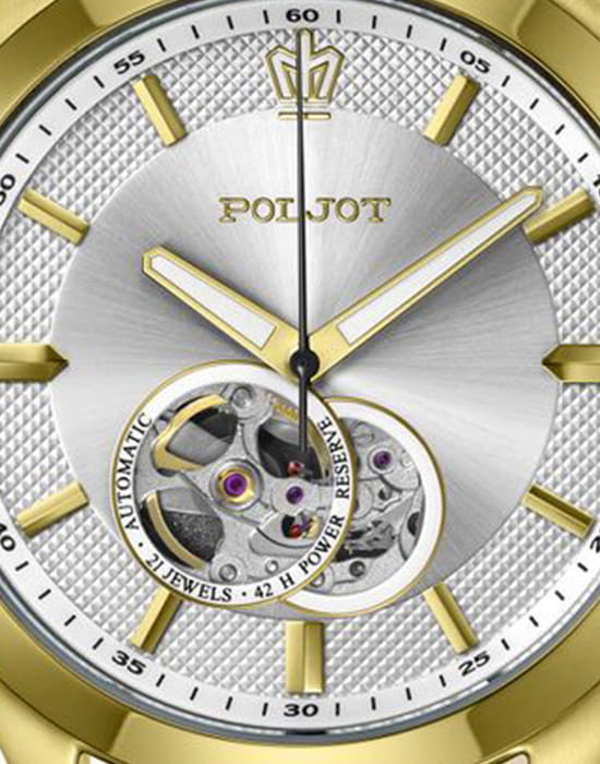 Poljot 82S0.746095 — элегантные механические мужские часы с автоподзаводом, сочетающие традиции отечественного часового производства и классический дизайн. Корпус из нержавеющей стали с тёплым золотистым с PVD-покрытиемPVDУльтратонкое покрытие наносится в технике вакуумного напыления, сочетает в себе нитрид титана особой прочности со слоем золота или оксида хрома. Несёт в себе декоративную или защитную функцию. придаёт модели благородный характер, а серебристый циферблат с чёткой разметкой подчёркивает функциональную строгость стиля. Надёжный механизм с автоподзаводом обеспечивает плавный ход стрелок и стабильную работу. Прочное минеральное стеклоМинеральное стеклоМинеральное стекло представляет собой искусственно выращенный минерал кварца. Такое стекло отличается особой устойчивостью к повреждениям и царапинам. Уступает по некоторым качествам сапфировому стеклу. защищает циферблат от повреждений, а ремешок из натуральной кожи с классической пряжкой добавляет образу утончённости и комфорта. Poljot — это воплощение надёжности, традиции и сдержанной элегантности, идеально подходящее для повседневного делового стиля.