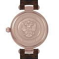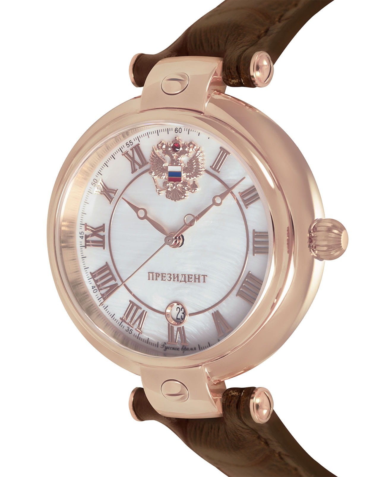 Круглые механические часы из коллекции «Президент» — это воплощение стиля и безупречного вкуса. Модель выполнена в форме с розовым золотом, а корпус диаметром 42 мм с толщиной 14 мм защищён сапфировым стекломСапфировое стеклоПрочный и надёжный материал из кристалла сапфира синтетического происхождения, характеризующийся особой твёрдостью и устойчивостью к царапинам и повреждениям., устойчивым к царапинам и обеспечивающим чёткое восприятие информации при любом освещении. Циферблат украшен кристаллами Swarovski. Часы оснащены механизмом с автоподзаводом, гарантирующим точность и надёжность. В комплект поставки входит подарочный футляр, паспорт с гарантийным талоном и фирменный пакет, что делает модель идеальным выбором для подарка. Задняя крышка с чеканкой Герба России подчёркивает национальную принадлежность и уникальность модели. Кожаный ремешок шириной 20 мм дополнен классической застёжкой, обеспечивая комфорт и элегантный стиль. Часы водонепроницаемы до 30 метров (), что позволяет использовать их в повседневных условиях — при мытье рук или под лёгким дождём. Эти часы станут универсальным аксессуаром для тех, кто ценит сочетание стиля, качества и символики — идеальный выбор для делового образа и торжественных случаев.