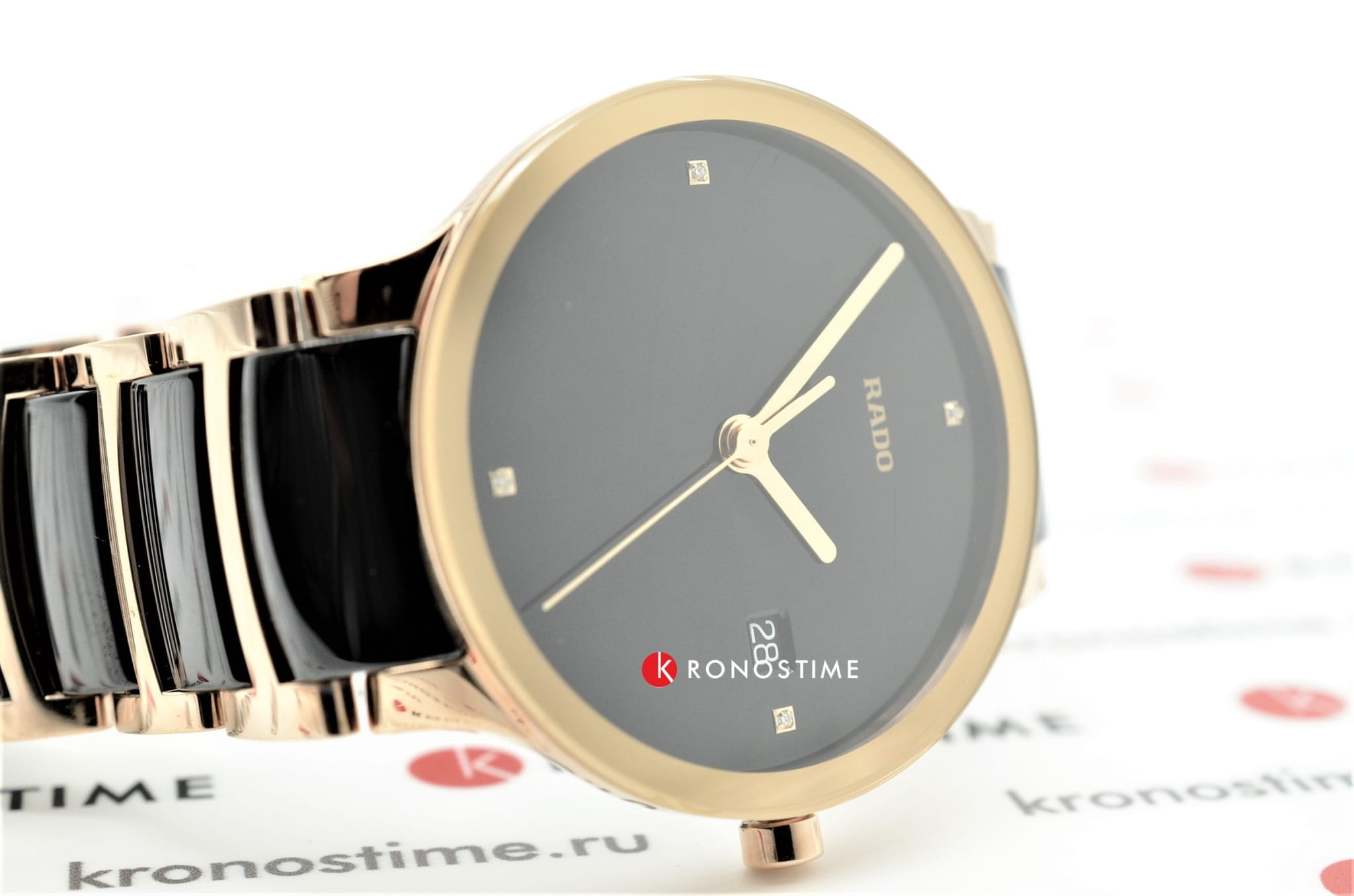 Круглый циферблат чёрного цвета выполнен в стиле минимализм. Он инкрустирован 4 бриллиантами весом в 0,011 карат, переливающиеся сияющие грани придают модели роскоши и великолепие. Оригинальный браслет из нержавеющей стали 316L имеет вставки из высокотехнологичной керамикиВысокотехнологичная керамикаИнновационный запатентованный Rado материал с гладкой или матовой поверхностью. Керамика за счёт кристаллической структуры обладает повышенной устойчивостью от возникновения царапин. Материал способен принимать температуру тела человека, обеспечивая невероятный комфорт при ношении.. Наручные часы оснащены кварцевым механизмом ETA 955.112 с высокой точностью хода. Надёжное стекло из сапфира. PVD-покрытиеPVDУльтратонкое покрытие наносится в технике вакуумного напыления, сочетает в себе нитрид титана особой прочности со слоем золота или оксида хрома. Несёт в себе декоративную или защитную функцию. цвета розового золота. Апертура даты. Диаметр корпуса: 38 мм.