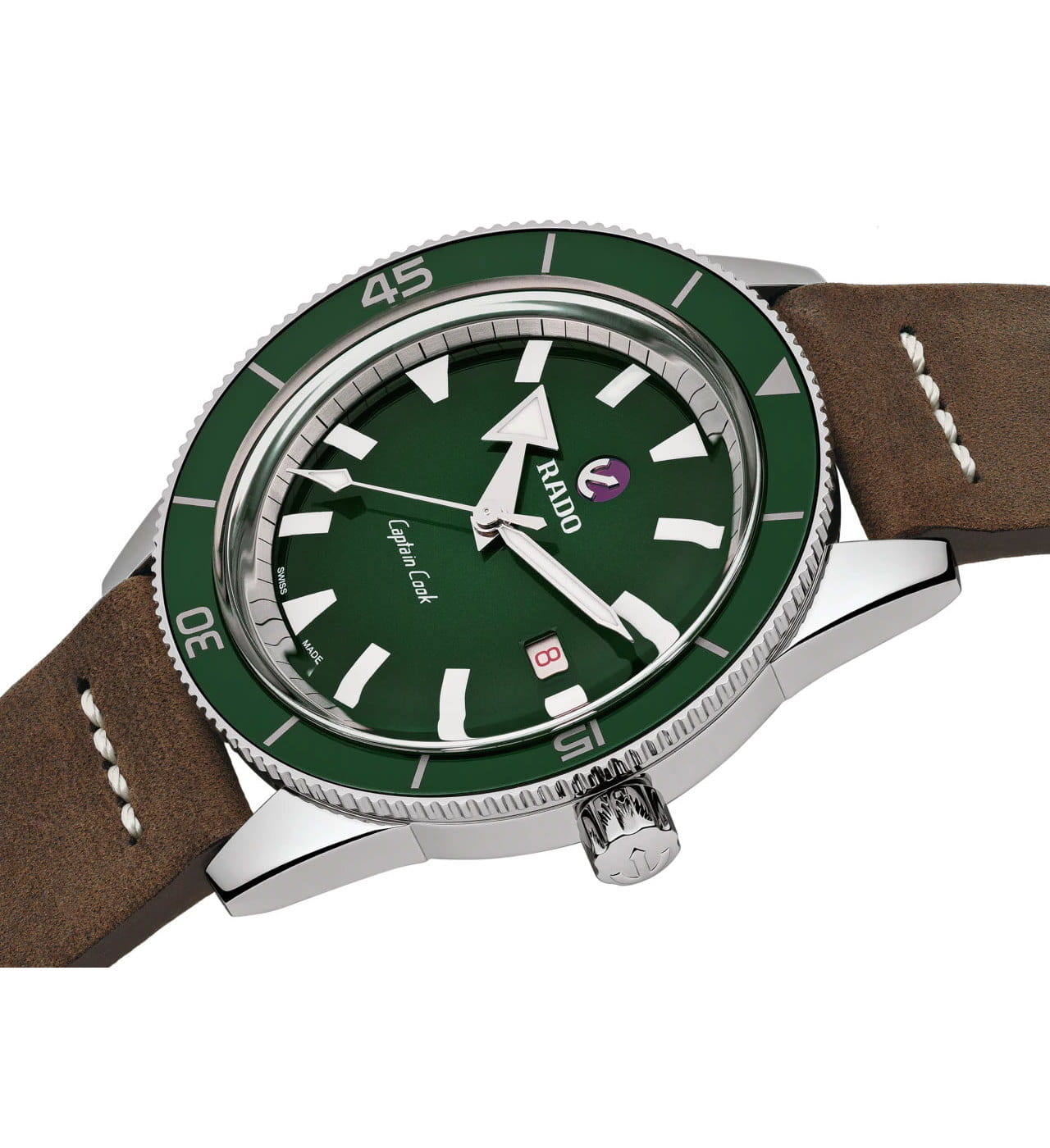 Премиальный аксессуар с винтажными элементами дизайна дополнен оригинальными стрелками, изображающими меч и стрелу. Надёжный корпус из нержавеющей стали 316L имеет зелёный безельБезельВнешний ободок, закрепляющий стекло. В спортивных часах так называется поворотное кольцо с делениями на циферблате, выполняет роль таймера – замеряет отрезки времени на шкале. Неподвижный безель – элемент декора. Однонаправленно вращающийся безель на дайверских часах позволяет фиксировать моменты погружения и выныривания на поверхность. из высокотехнологичной керамикиВысокотехнологичная керамикаИнновационный запатентованный Rado материал с гладкой или матовой поверхностью. Керамика за счёт кристаллической структуры обладает повышенной устойчивостью от возникновения царапин. Материал способен принимать температуру тела человека, обеспечивая невероятный комфорт при ношении., снижающий вес часов и препятствующий возникновению царапин. Швейцарский автоматический механизм ETA C07.611 с 80-часовым резервом хода. Стекло из сапфира с антибликовым покрытием. Ремешок из натуральной кожи. Люминесцентная подсветкаЛюминесцентное покрытиеПозволяет считывать показания времени в темноте. Производители наносят на стрелки, часовые индексы, безель или поверхность циферблата светонакопительный состав, дающий холодное свечение.. Водостойкость 20 бар. Завинчивающаяся задняя крышка с гравировкой, закручивающаяся заводная головка. . Отображение числа. Диаметр корпуса: 42 мм.
