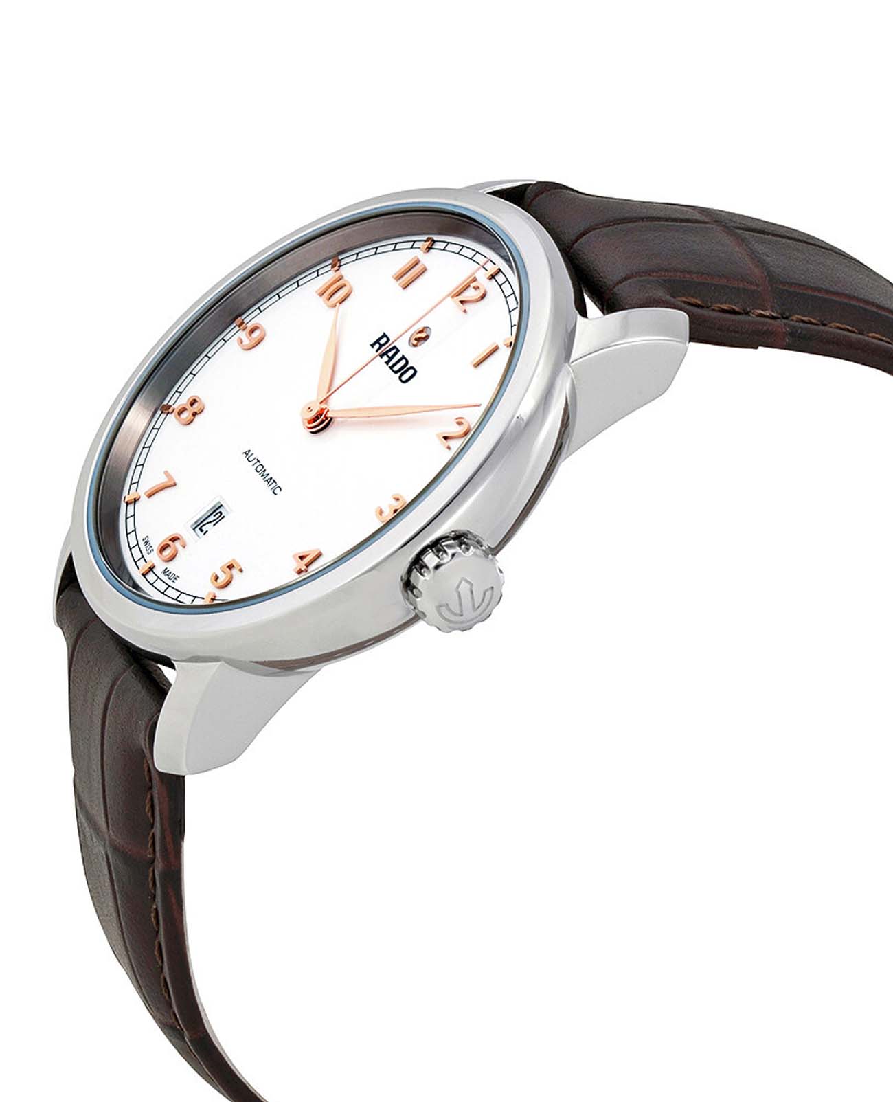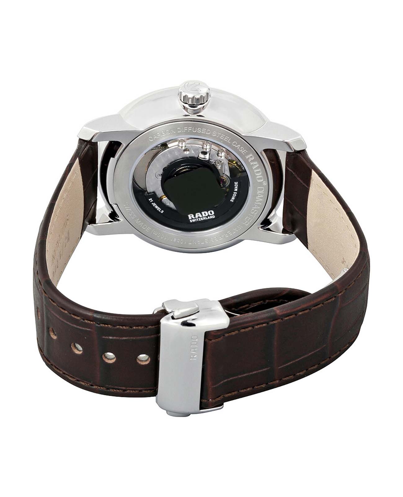 Мужские механические швейцарские часы с автоподзаводом Rado Diamaster R14077136. Сапфировое стеклоСапфировое стеклоПрочный и надёжный материал из кристалла сапфира синтетического происхождения, характеризующийся особой твёрдостью и устойчивостью к царапинам и повреждениям. устойчивое к мелким механическим повреждениям. Корпус часов изготовлен из нержавеющей стали. Окошко даты находится в положении 6 часов. Класс водозащиты: 100 метров, позволит плавать, нырять и заниматься другими водными видами спорта. Кожаный ремешок на раскладной застёжкеРаскладная застёжкаТакой тип застёжки используется только на браслетах из металла. Она никогда не раскрывается полностью, происходит разделение на 2 и более частей. Раскладывающая застёжка снизит вероятность потери часов к минимуму..