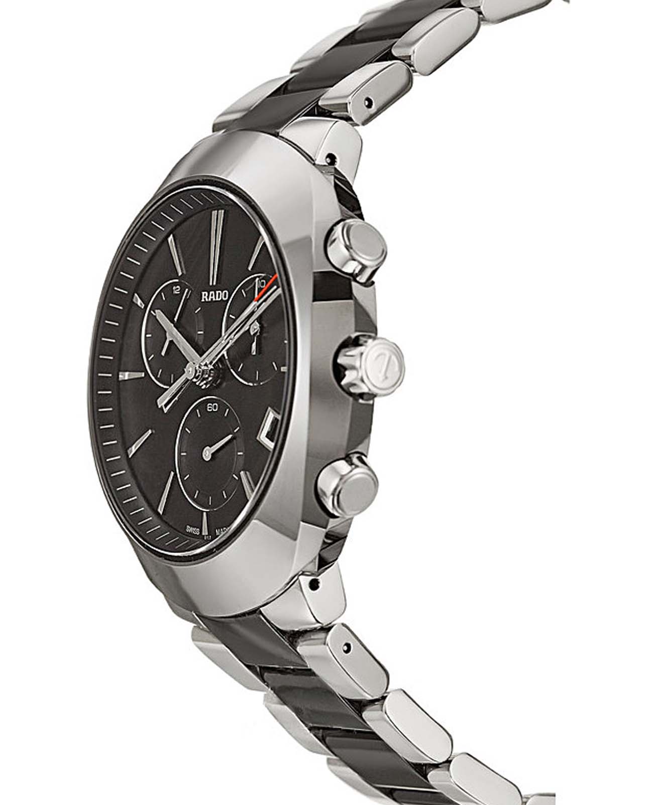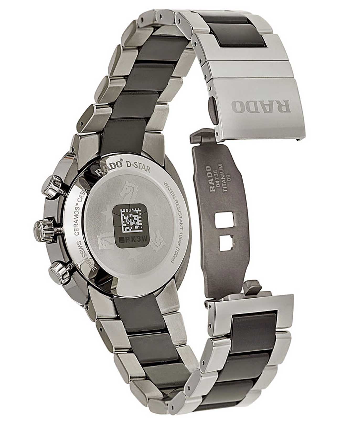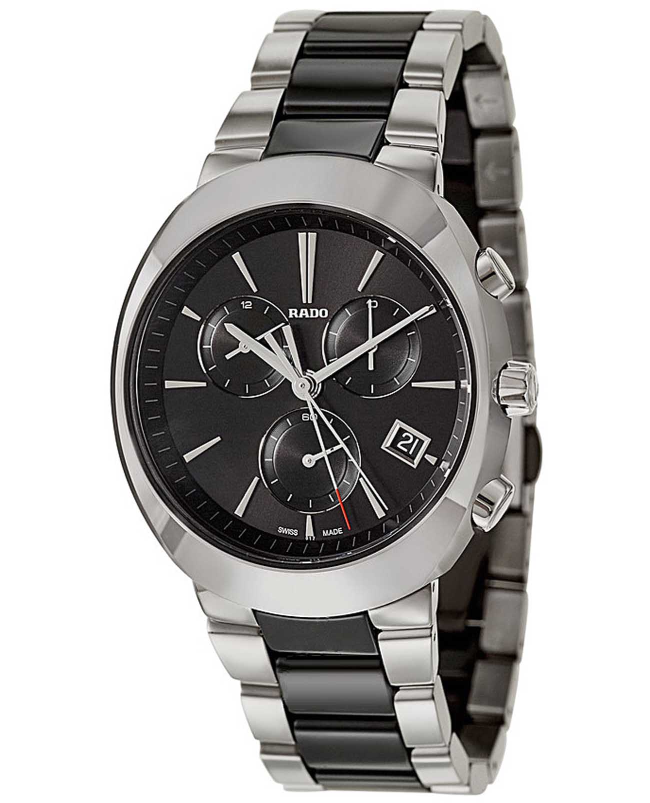 Мужские швейцарские часы-хронографХронографФункция позволяет измерять отрезки времени с особой точностью: часы, минуты, секунды. Верным признаком хронографа является наличие на циферблате 3 дополнительных окошек-счётчиков. Rado D-Star Chronograph R15937172. Сапфировое стеклоСапфировое стеклоПрочный и надёжный материал из кристалла сапфира синтетического происхождения, характеризующийся особой твёрдостью и устойчивостью к царапинам и повреждениям. устойчивое к мелким механическим повреждениям. Корпус часов изготовлен из CeramosCeramosМатериал являет собой инновационное сочетание высокотехнологичной керамики и сплава металла. Он объединяет керамическую устойчивость к царапинам и металлический роскошный блеск. . Окошко даты находится в положении 3 часа. Класс водозащиты: 100 метров, позволит плавать, нырять и заниматься другими водными видами спорт. Браслет из нержавеющей стали с керамикой на раскладной застёжкеРаскладная застёжкаТакой тип застёжки используется только на браслетах из металла. Она никогда не раскрывается полностью, происходит разделение на 2 и более частей. Раскладывающая застёжка снизит вероятность потери часов к минимуму..