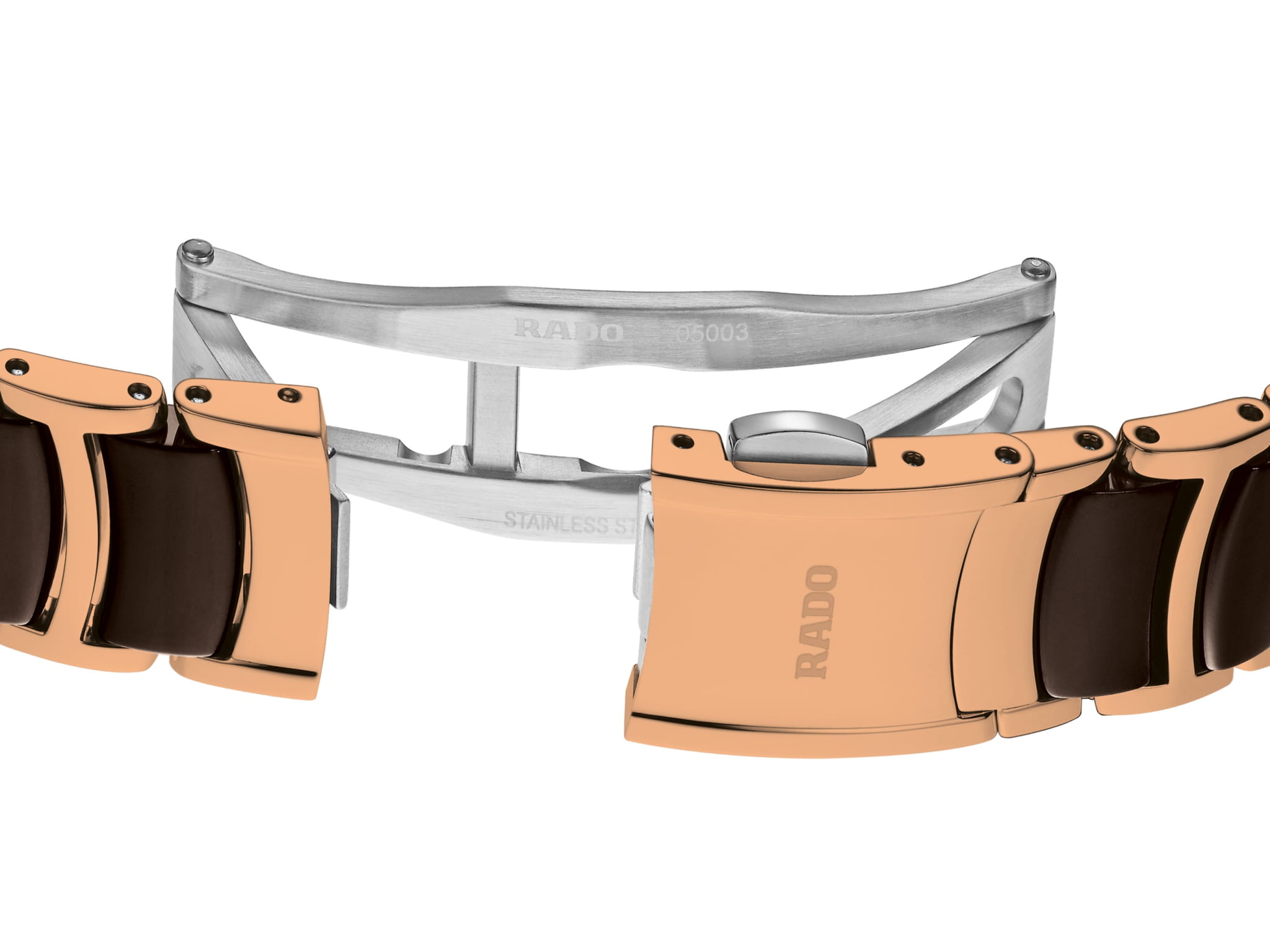 Швейцарские женские часы с надёжным кварцевым механизмом Rado Centrix Diamonds R30024732. Корпус часов изготовлен из нержавеющей стали с PVD-покрытиемPVDУльтратонкое покрытие наносится в технике вакуумного напыления, сочетает в себе нитрид титана особой прочности со слоем золота или оксида хрома. Несёт в себе декоративную или защитную функцию.. Браслет из стали и высокотехнологичной керамикиВысокотехнологичная керамикаИнновационный запатентованный Rado материал с гладкой или матовой поверхностью. Керамика за счёт кристаллической структуры обладает повышенной устойчивостью от возникновения царапин. Материал способен принимать температуру тела человека, обеспечивая невероятный комфорт при ношении. на раскладной застёжкеРаскладная застёжкаТакой тип застёжки используется только на браслетах из металла. Она никогда не раскрывается полностью, происходит разделение на 2 и более частей. Раскладывающая застёжка снизит вероятность потери часов к минимуму.. Сапфировое стеклоСапфировое стеклоПрочный и надёжный материал из кристалла сапфира синтетического происхождения, характеризующийся особой твёрдостью и устойчивостью к царапинам и повреждениям. устойчивое к мелким механическим повреждениям. Класс водозащиты: 50 метров, позволит защитить корпус от случайных брызг или капель дождя. Окошко даты находится в положении 6 часов. Циферблат инкрустирован бриллиантами.