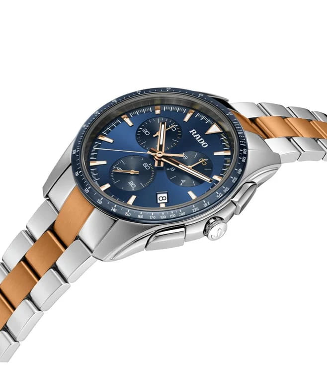 Мужские наручные часы-хронографХронографФункция позволяет измерять отрезки времени с особой точностью: часы, минуты, секунды. Верным признаком хронографа является наличие на циферблате 3 дополнительных окошек-счётчиков. Rado Hyperchrome Chronograph. Корпус часов изготовлен из нержавеющей стали. БезельБезельВнешний ободок, закрепляющий стекло. В спортивных часах так называется поворотное кольцо с делениями на циферблате, выполняет роль таймера – замеряет отрезки времени на шкале. Неподвижный безель – элемент декора. Однонаправленно вращающийся безель на дайверских часах позволяет фиксировать моменты погружения и выныривания на поверхность. из нержавеющей стали с PVD-покрытиемPVDУльтратонкое покрытие наносится в технике вакуумного напыления, сочетает в себе нитрид титана особой прочности со слоем золота или оксида хрома. Несёт в себе декоративную или защитную функцию... Стальной браслет с частичным PVD-покрытиемPVDУльтратонкое покрытие наносится в технике вакуумного напыления, сочетает в себе нитрид титана особой прочности со слоем золота или оксида хрома. Несёт в себе декоративную или защитную функцию. на застёжкой «бабочка» с кнопкамиЗастёжка "бабочка"Такой вид застёжки дополняется предохранителями, помогающими избежать случайного раскрытия браслета. Обладают изящным исполнением. . БезельБезельВнешний ободок, закрепляющий стекло. В спортивных часах так называется поворотное кольцо с делениями на циферблате, выполняет роль таймера – замеряет отрезки времени на шкале. Неподвижный безель – элемент декора. Однонаправленно вращающийся безель на дайверских часах позволяет фиксировать моменты погружения и выныривания на поверхность. со шкалой тахиметраТахиметрРазмеченная шкала, располагается на ободке или безеле часов. Тахиметр позволяет рассчитать скорость на определённом участке пути, расстояние измеряется в километрах или милях.. Окошко даты находится в положении 4 часа. Стрелки и метки с люминесцентным покрытиемЛюминесцентное покрытиеПозволяет считывать показания времени в темноте. Производители наносят на стрелки, часовые индексы, безель или поверхность циферблата светонакопительный состав, дающий холодное свечение.. Сапфировое стеклоСапфировое стеклоПрочный и надёжный материал из кристалла сапфира синтетического происхождения, характеризующийся особой твёрдостью и устойчивостью к царапинам и повреждениям. с антибликовым покрытиемАнтибликовое покрытиеСлой оксида металла в 0,13-0,3 микрон, благодаря которому стекло часов не бликует и не отражает свет. Антибликовое покрытие уменьшает отражение света в 10 раз, обеспечивая отличную читаемость показателей циферблата. устойчивое к мелким механическим повреждениям. Класс водозащиты: 100 метров, позволит плавать, нырять и заниматься другими водными видами спорта.