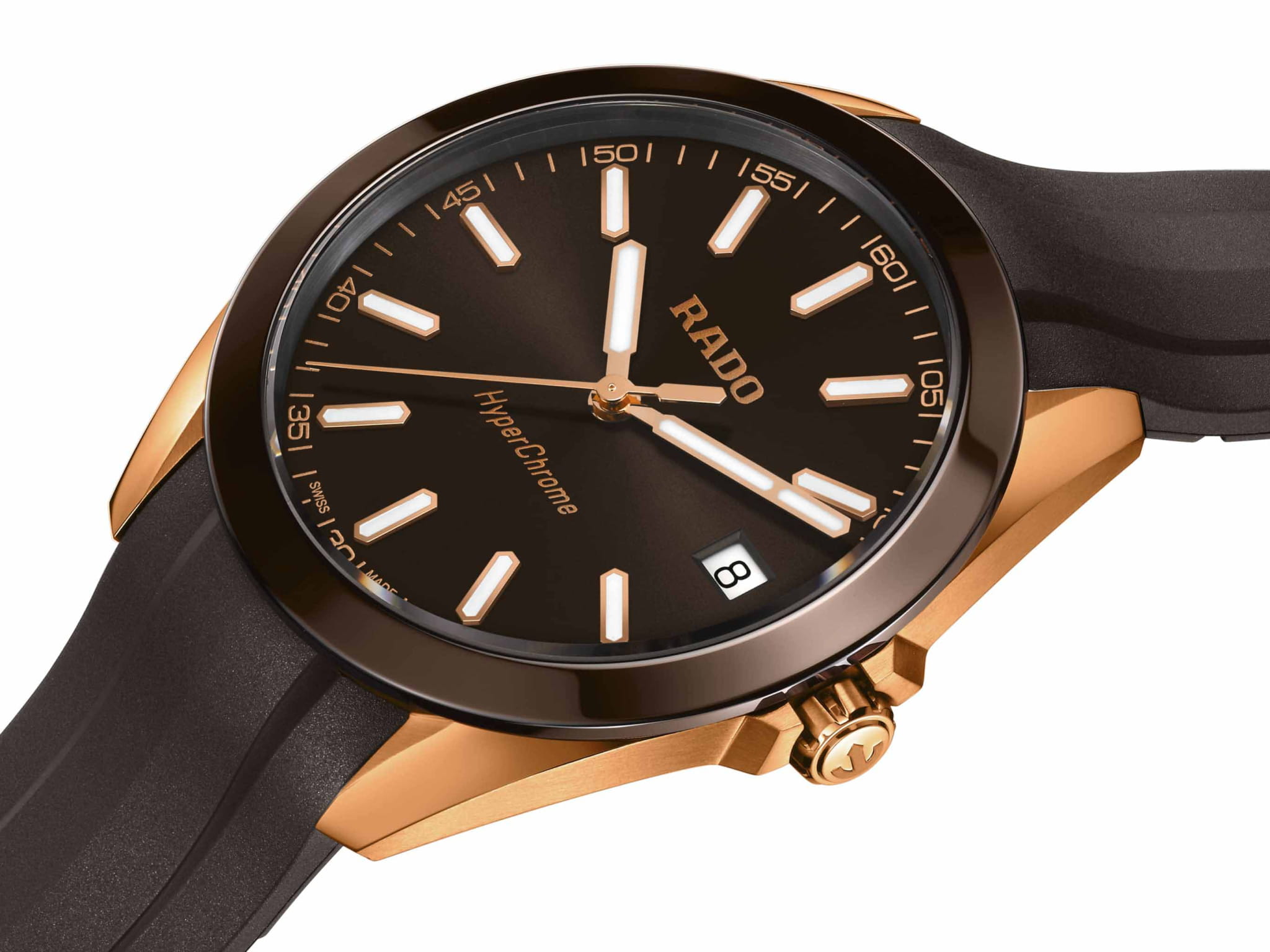 Мужские кварцевые часы Rado HyperChrome — это современное воплощение точности и мастерства материалов. Корпус диаметром 41,5 мм и толщиной 11,7 мм выполнен из нержавеющей стали с PVD-покрытиемPVDУльтратонкое покрытие наносится в технике вакуумного напыления, сочетает в себе нитрид титана особой прочности со слоем золота или оксида хрома. Несёт в себе декоративную или защитную функцию. розового золота, полированной и матовой. БезельБезельВнешний ободок, закрепляющий стекло. В спортивных часах так называется поворотное кольцо с делениями на циферблате, выполняет роль таймера – замеряет отрезки времени на шкале. Неподвижный безель – элемент декора. Однонаправленно вращающийся безель на дайверских часах позволяет фиксировать моменты погружения и выныривания на поверхность. изготовлен из высокотехнологичной керамикиВысокотехнологичная керамикаИнновационный запатентованный Rado материал с гладкой или матовой поверхностью. Керамика за счёт кристаллической структуры обладает повышенной устойчивостью от возникновения царапин. Материал способен принимать температуру тела человека, обеспечивая невероятный комфорт при ношении. коричневого цвета, придающей часам прочность и изысканность. Циферблат коричневого цвета с эффектом «солнечные лучи» оформлен накладными индексами и стрелками розового золота с люминесцентным покрытиемЛюминесцентное покрытиеПозволяет считывать показания времени в темноте. Производители наносят на стрелки, часовые индексы, безель или поверхность циферблата светонакопительный состав, дающий холодное свечение. Super-Luminova®. Особенность подсветки — зелёное свечение метки 12 часов и минутной стрелки, и синее — остальных индексов и часовой стрелки, что обеспечивает интуитивное считывание времени в темноте. Циферблат защищён выпуклым сапфировым стекломСапфировое стеклоПрочный и надёжный материал из кристалла сапфира синтетического происхождения, характеризующийся особой твёрдостью и устойчивостью к царапинам и повреждениям. с антибликовым покрытиемАнтибликовое покрытиеСлой оксида металла в 0,13-0,3 микрон, благодаря которому стекло часов не бликует и не отражает свет. Антибликовое покрытие уменьшает отражение света в 10 раз, обеспечивая отличную читаемость показателей циферблата. на внутренней стороне. Механизм — кварцевый. Окошко даты расположено в положении 3 часов. Часы оснащены каучуковым ремешком коричневого цвета с пряжкой из нержавеющей стали с PVD-покрытиемPVDУльтратонкое покрытие наносится в технике вакуумного напыления, сочетает в себе нитрид титана особой прочности со слоем золота или оксида хрома. Несёт в себе декоративную или защитную функцию. розового золота. Водонепроницаемость 150 м позволяет использовать часы для плавания и повседневного ношения. Идеальный выбор для тех, кто ценит инновации, точность и смелый дизайн.