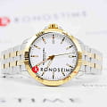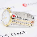 Белый циферблат украшен центральными стрелками, покрытыми люминесцентным покрытиемЛюминесцентное покрытиеПозволяет считывать показания времени в темноте. Производители наносят на стрелки, часовые индексы, безель или поверхность циферблата светонакопительный состав, дающий холодное свечение., а в позиции 3 часа расположена апертура даты.