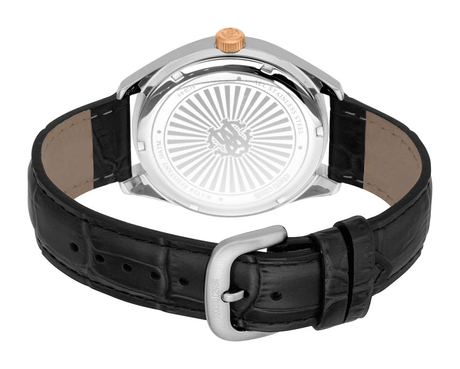 ROBERTO CAVALLI Uomo Mio RC5G048L0035 — стильные итальянские часы, которые сочетают в себе элегантность и современный функционал. Круглый корпус диаметром 42 мм выполнен из нержавеющей стали, толщина корпуса составляет 12 мм, что придает модели выразительный внешний вид и надежную защиту от внешних воздействий. Часы оснащены кварцевым механизмом, также обладают функцией отображения даты, что делает их удобными для ежедневного использования. Минеральное стеклоМинеральное стеклоМинеральное стекло представляет собой искусственно выращенный минерал кварца. Такое стекло отличается особой устойчивостью к повреждениям и царапинам. Уступает по некоторым качествам сапфировому стеклу. защищает часы от царапин. Водозащита 100 метров, позволит плавать, нырять и заниматься другими водными видами спорта. Кожаный ремешок на стандартной застёжке обеспечивает комфортное ношение. Неподвижный безельБезельВнешний ободок, закрепляющий стекло. В спортивных часах так называется поворотное кольцо с делениями на циферблате, выполняет роль таймера – замеряет отрезки времени на шкале. Неподвижный безель – элемент декора. Однонаправленно вращающийся безель на дайверских часах позволяет фиксировать моменты погружения и выныривания на поверхность. с PVD-покрытиемPVDУльтратонкое покрытие наносится в технике вакуумного напыления, сочетает в себе нитрид титана особой прочности со слоем золота или оксида хрома. Несёт в себе декоративную или защитную функцию.. Стрелки и метки с люминесцентным покрытиемЛюминесцентное покрытиеПозволяет считывать показания времени в темноте. Производители наносят на стрелки, часовые индексы, безель или поверхность циферблата светонакопительный состав, дающий холодное свечение. обеспечивают отличную читаемость в любое время суток.