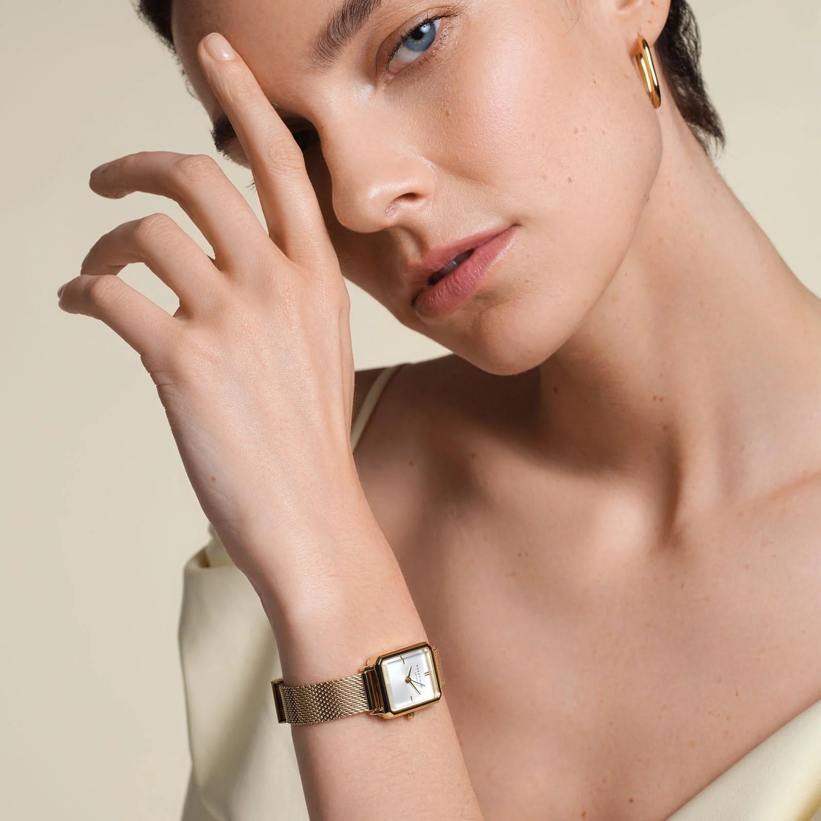 Женские кварцевые часы. Центральные часовая, минутная и секундная стрелки. Белый циферблат. Восьмиугольный корпус выполнен из полированной нержавеющей стали с IP-покрытиемIP-покрытиеМетод ионного напыления. Демонстрирует повышенную устойчивость к истиранию, окислению и химическим веществам. Под воздействием высокого давления и температуры около 1500°C молекулы металла надёжно соединяются с частицами корпуса часов. цвета желтого золота. Размер корпуса составляет 21,5 х 27,5 мм. Стальной браслет c IP-покрытиемIP-покрытиеМетод ионного напыления. Демонстрирует повышенную устойчивость к истиранию, окислению и химическим веществам. Под воздействием высокого давления и температуры около 1500°C молекулы металла надёжно соединяются с частицами корпуса часов. с ювелирной застежкой. Прочное минеральное стеклоМинеральное стеклоМинеральное стекло представляет собой искусственно выращенный минерал кварца. Такое стекло отличается особой устойчивостью к повреждениям и царапинам. Уступает по некоторым качествам сапфировому стеклу. устойчивое к мелким механическим повреждениям. Водостойкость WR 30 (брызги). В комплекте аксессуар - женский браслет.