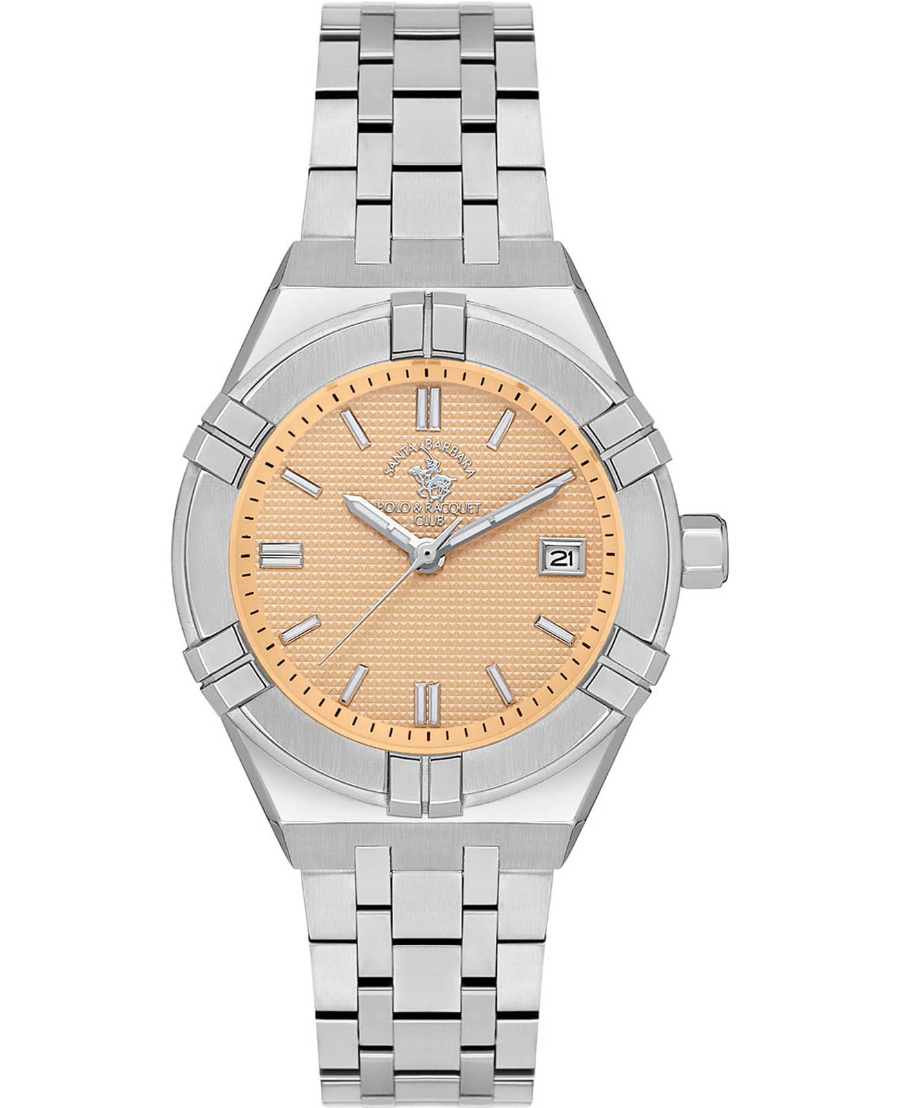 Женские кварцевые Santa Barbara Polo & Racquet Club Luxury SB.1.10559-1 — воплощение элегантности и технического совершенства. Изысканный корпус из стали 316L серебристого цвета, диаметром 35 мм, что делает их устойчивыми к внешним воздействиям и придает благородный вид. Стрелки и метки с люминесцентным покрытиемЛюминесцентное покрытиеПозволяет считывать показания времени в темноте. Производители наносят на стрелки, часовые индексы, безель или поверхность циферблата светонакопительный состав, дающий холодное свечение., обеспечивающим хорошую читаемость в темноте. Изящный циферблат защищён минеральным стекломМинеральное стеклоМинеральное стекло представляет собой искусственно выращенный минерал кварца. Такое стекло отличается особой устойчивостью к повреждениям и царапинам. Уступает по некоторым качествам сапфировому стеклу., устойчивое к царапинам и механическим повреждениям. Окошко даты находится в положении 3 часа. Браслет из стали с застёжкой «бабочка»Застёжка "бабочка"Такой вид застёжки дополняется предохранителями, помогающими избежать случайного раскрытия браслета. Обладают изящным исполнением. , обеспечивающим комфортное и безопасное ношение. Водонепроницаемость 50 метров позволит защитить корпус от случайных брызг или капель дождя. Идеальный выбор для тех, кто ценит элегантный дизайн и качество.