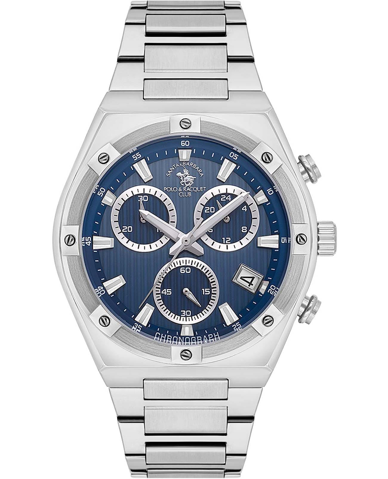 Santa Barbara Polo & Racquet Club Legend SB.1.10583-2 — стильные кварцевые мужские наручные часы-хронографХронографФункция позволяет измерять отрезки времени с особой точностью: часы, минуты, секунды. Верным признаком хронографа является наличие на циферблате 3 дополнительных окошек-счётчиков. с секундомеромСекундомерСекундоме́р — прибор, способный измерять интервалы времени с точностью до долей секунды., сочетающие спортивную динамику и функциональность. Крупный корпус выполнен из нержавеющей стали и гармонично дополнен стальным браслетом на раскладной застёжкеРаскладная застёжкаТакой тип застёжки используется только на браслетах из металла. Она никогда не раскрывается полностью, происходит разделение на 2 и более частей. Раскладывающая застёжка снизит вероятность потери часов к минимуму.. Циферблат с акцентными метками и стрелками с люминесцентным покрытиемЛюминесцентное покрытиеПозволяет считывать показания времени в темноте. Производители наносят на стрелки, часовые индексы, безель или поверхность циферблата светонакопительный состав, дающий холодное свечение. оформлен в многослойной структуре и оснащён вспомогательными индикаторами, включая 24-часовой формат времени. В нижней части расположено окошко даты, что делает модель ещё более практичной. Минеральное стеклоМинеральное стеклоМинеральное стекло представляет собой искусственно выращенный минерал кварца. Такое стекло отличается особой устойчивостью к повреждениям и царапинам. Уступает по некоторым качествам сапфировому стеклу. защищает циферблат от царапин, а кварцевый механизм обеспечивает высокую точность. Благодаря своей универсальной эстетике эти часы уместны и в деловой среде, и в повседневном образе.