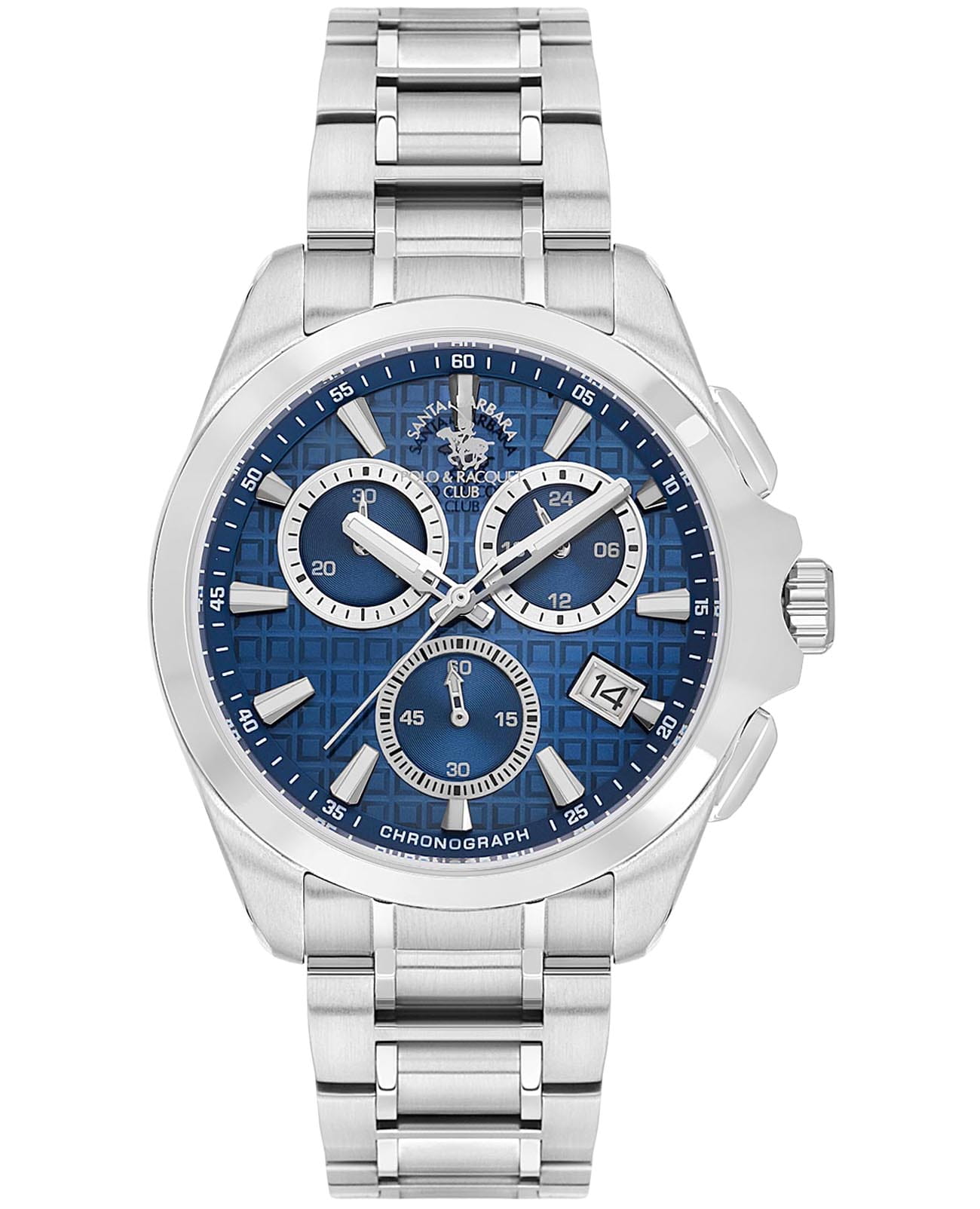 Мужские кварцевые часы-хронографХронографФункция позволяет измерять отрезки времени с особой точностью: часы, минуты, секунды. Верным признаком хронографа является наличие на циферблате 3 дополнительных окошек-счётчиков. с секундомеромСекундомерСекундоме́р — прибор, способный измерять интервалы времени с точностью до долей секунды. Santa Barbara Polo & Racquet Club SB.1.10591-3 — воплощение элегантности и технического совершенства. Корпус из нержавеющей стали серебристого цвета, диаметром 43 мм, что делает их устойчивыми к внешним воздействиям и придает благородный вид. Стрелки и метки с люминесцентным покрытиемЛюминесцентное покрытиеПозволяет считывать показания времени в темноте. Производители наносят на стрелки, часовые индексы, безель или поверхность циферблата светонакопительный состав, дающий холодное свечение., обеспечивающим хорошую читаемость в темноте. Циферблат защищён минеральным стекломМинеральное стеклоМинеральное стекло представляет собой искусственно выращенный минерал кварца. Такое стекло отличается особой устойчивостью к повреждениям и царапинам. Уступает по некоторым качествам сапфировому стеклу. устойчивое к царапинам и механическим повреждениям. 12-ти и 24-х часовой формат времени. Окошко даты находится в положении 4 часа. Фактурный циферблат с квадратными ячейками, украшен фирменным логотипом. Накладные метки в виде штрихов. Стальной браслет на раскладной застёжке с фиксаторомРаскладная застёжкаТакой тип застёжки используется только на браслетах из металла. Она никогда не раскрывается полностью, происходит разделение на 2 и более частей. Раскладывающая застёжка снизит вероятность потери часов к минимуму. обеспечивает комфортное и безопасное ношение. Водонепроницаемость 50 метров позволит защитить корпус от случайных брызг или капель дождя. Идеальный выбор для тех, кто ценит элегантный дизайн и качество.