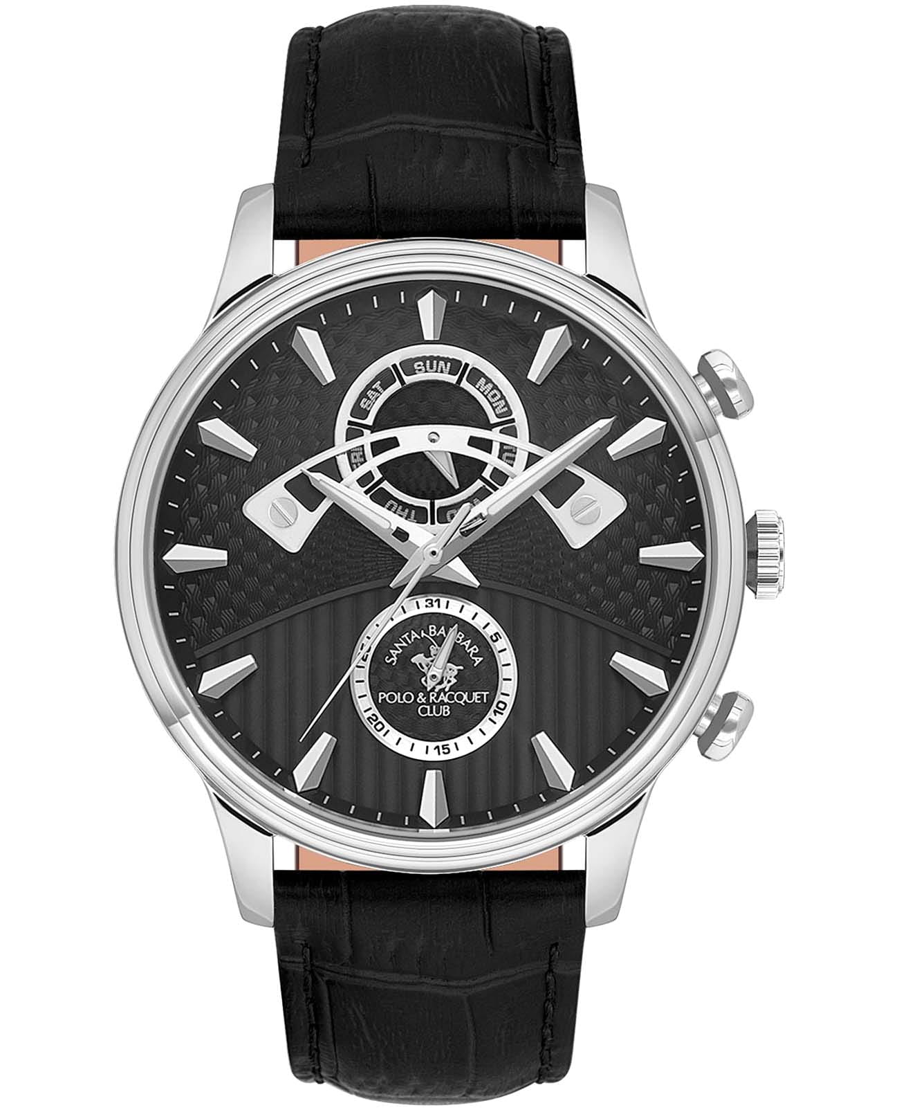 Мужские кварцевые часы Santa Barbara Polo & Racquet Club SB.1.10593-2— воплощение элегантности и технического совершенства. Корпус из нержавеющей стали серебристого цвета, диаметром 45 мм, что делает их устойчивыми к внешним воздействиям и придает благородный вид. Стрелки с люминесцентным покрытиемЛюминесцентное покрытиеПозволяет считывать показания времени в темноте. Производители наносят на стрелки, часовые индексы, безель или поверхность циферблата светонакопительный состав, дающий холодное свечение., обеспечивающим хорошую читаемость в темноте. Циферблат защищён минеральным стекломМинеральное стеклоМинеральное стекло представляет собой искусственно выращенный минерал кварца. Такое стекло отличается особой устойчивостью к повреждениям и царапинам. Уступает по некоторым качествам сапфировому стеклу. устойчивое к царапинам и механическим повреждениям. Циферблат разделен на две фактурные части и украшен фирменным логотипом. Дата и день недели вынесены на отдельные циферблаты. Кожаный ремешок на застёжке-бабочке с кнопкамиЗастёжка "бабочка"Такой вид застёжки дополняется предохранителями, помогающими избежать случайного раскрытия браслета. Обладают изящным исполнением. обеспечивает комфортное и безопасное ношение. Водонепроницаемость 50 метров позволит защитить корпус от случайных брызг или капель дождя. Идеальный выбор для тех, кто ценит элегантный дизайн и качество.