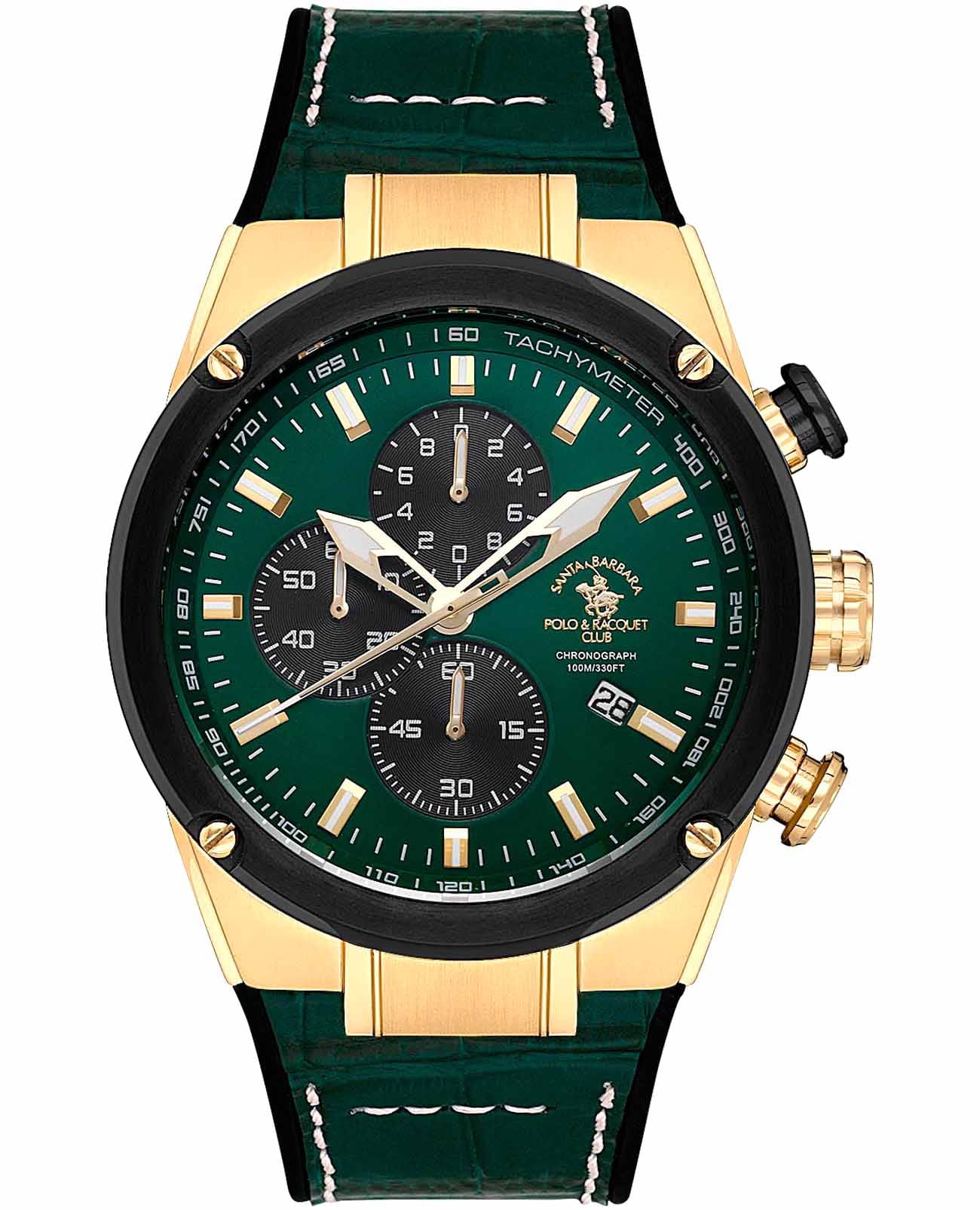 Мужские кварцевые часы-хронографХронографФункция позволяет измерять отрезки времени с особой точностью: часы, минуты, секунды. Верным признаком хронографа является наличие на циферблате 3 дополнительных окошек-счётчиков. с секундомеромСекундомерСекундоме́р — прибор, способный измерять интервалы времени с точностью до долей секунды. Santa Barbara Polo & Racquet Club SB.3.10001-5 — воплощение элегантности и технического совершенства. Корпус из нержавеющей стали с IP-покрытиемIP-покрытиеМетод ионного напыления. Демонстрирует повышенную устойчивость к истиранию, окислению и химическим веществам. Под воздействием высокого давления и температуры около 1500°C молекулы металла надёжно соединяются с частицами корпуса часов. золотистого цвета, диаметром 45 мм, что делает их устойчивыми к внешним воздействиям и придает благородный вид. Стрелки и метки с люминесцентным покрытиемЛюминесцентное покрытиеПозволяет считывать показания времени в темноте. Производители наносят на стрелки, часовые индексы, безель или поверхность циферблата светонакопительный состав, дающий холодное свечение., обеспечивающим хорошую читаемость в темноте. Неподвижный безельБезельВнешний ободок, закрепляющий стекло. В спортивных часах так называется поворотное кольцо с делениями на циферблате, выполняет роль таймера – замеряет отрезки времени на шкале. Неподвижный безель – элемент декора. Однонаправленно вращающийся безель на дайверских часах позволяет фиксировать моменты погружения и выныривания на поверхность. с IP-покрытиемIP-покрытиеМетод ионного напыления. Демонстрирует повышенную устойчивость к истиранию, окислению и химическим веществам. Под воздействием высокого давления и температуры около 1500°C молекулы металла надёжно соединяются с частицами корпуса часов. черного цвета. Циферблат защищён минеральным стекломМинеральное стеклоМинеральное стекло представляет собой искусственно выращенный минерал кварца. Такое стекло отличается особой устойчивостью к повреждениям и царапинам. Уступает по некоторым качествам сапфировому стеклу. устойчивое к царапинам и механическим повреждениям. Окошко даты находится в положении 4 часа, тахиметрТахиметрРазмеченная шкала, располагается на ободке или безеле часов. Тахиметр позволяет рассчитать скорость на определённом участке пути, расстояние измеряется в километрах или милях. по внешнему краю. Кожаный ремешок на стандартной застёжке обеспечивает комфортное и безопасное ношение. Водонепроницаемость 100 метров позволит плавать, нырять и заниматься другими водными видами спорта. Идеальный выбор для тех, кто ценит элегантный дизайн и качество.