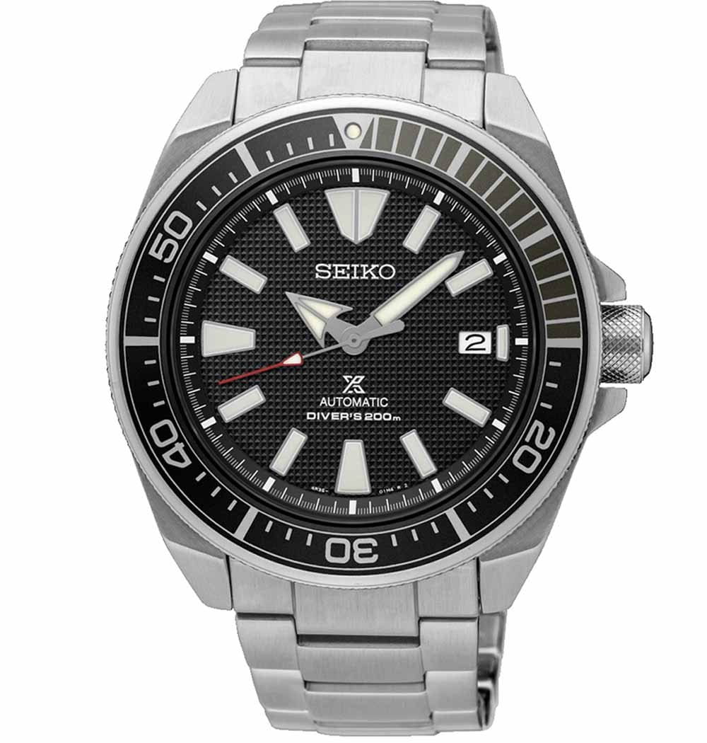 В наручных часах выражен дайверский подтекст: однонаправленно вращающийся безельБезельВнешний ободок, закрепляющий стекло. В спортивных часах так называется поворотное кольцо с делениями на циферблате, выполняет роль таймера – замеряет отрезки времени на шкале. Неподвижный безель – элемент декора. Однонаправленно вращающийся безель на дайверских часах позволяет фиксировать моменты погружения и выныривания на поверхность., крупная индикация времени, завинчивающаяся заводная головка с системой защиты, повышенная водонепроницаемость в 200 метров. Модель с автоматическим подзаводом работает за счёт японского пружинного механизма Seiko 4R35 с запасом хода, рассчитанным на 41 час. Узорчатый чёрный циферблат дополнен стрелками и метками с люминесцентным покрытиемЛюминесцентное покрытиеПозволяет считывать показания времени в темноте. Производители наносят на стрелки, часовые индексы, безель или поверхность циферблата светонакопительный состав, дающий холодное свечение., позволяющим пользоваться часами и в темноте. Минеральное стекло Hardlex отличается прочностью и устойчивостью к царапинам. Для изготовления корпуса и браслета выбрали сталь 316L, материал ценится за долговечность, антикоррозионные свойства. Практичной функцией является отображение текущего числа. Диаметр корпуса: 43,8 мм.