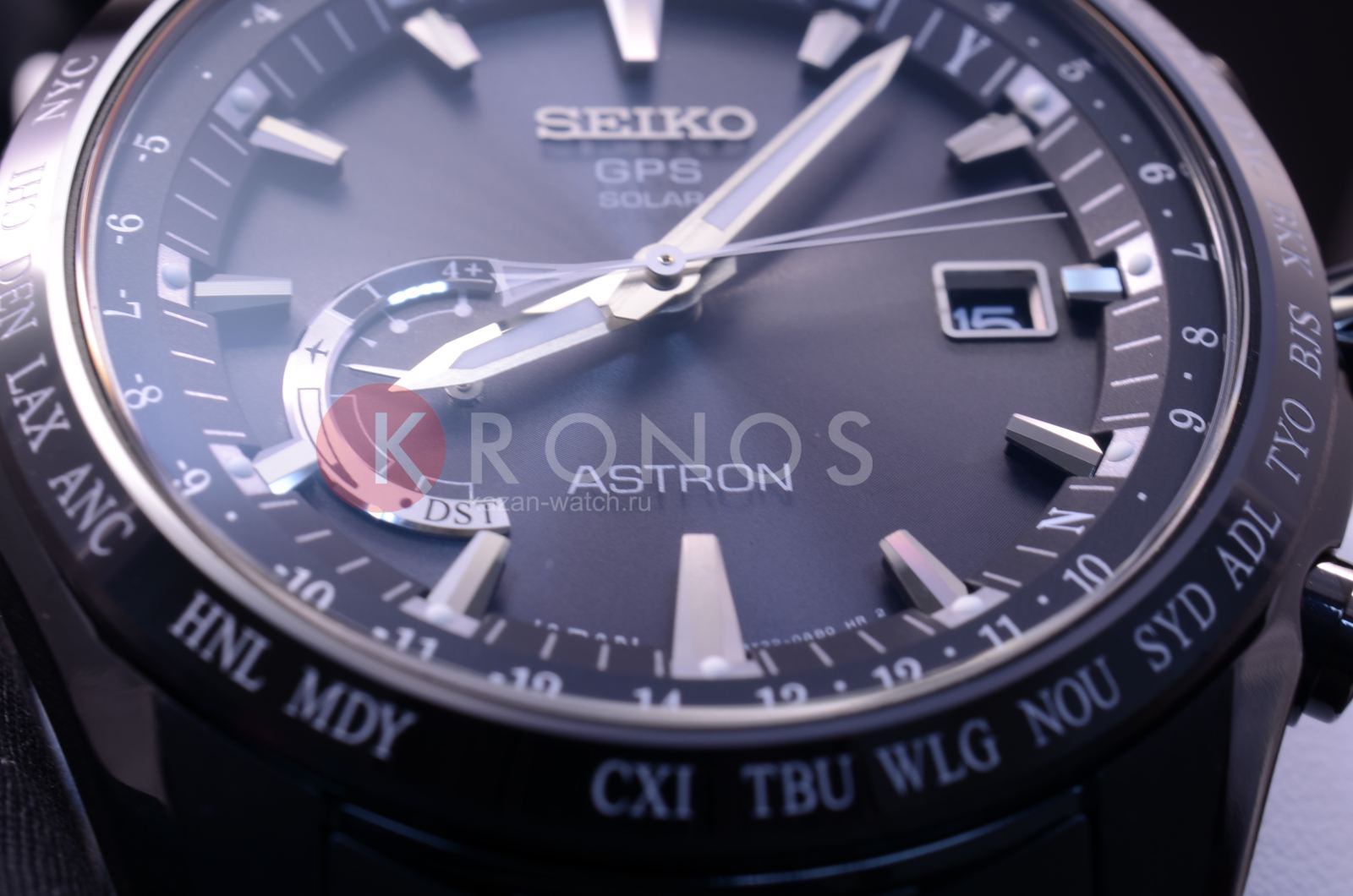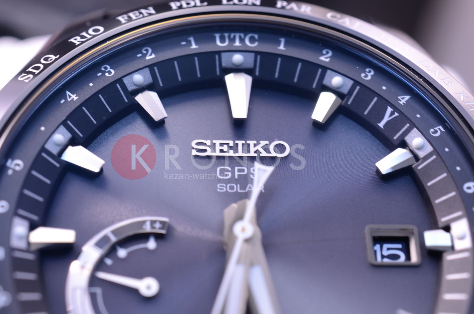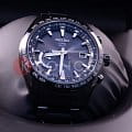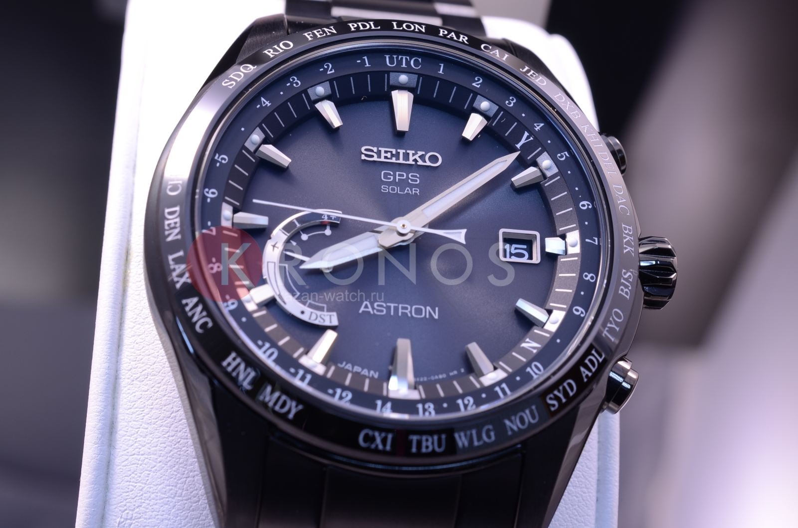 Astron GPS Solar World-Time. Часы со встроенным GPS-приемником определяют часовой пояс, дату и точное время. Питание от солнечной энергии, индикатор уровня зарядки батареи. Функция сохранения энергии. Запас хода при полной зарядке аккумулятора 6 месяцев, при включенной функции сохранения энергии - 2 года. Ручная и автоматическая корректировка времени и часового пояса. Установка летнего времени. Функции приема GPS-сигнала: режим ''В полете'', показ количества спутников, показ результата последнего приема, проверка установленного часового пояса, автоматический прием информации о секунде координации. Мировое время - часы распознают 40 часовых поясов. Ретроградный индикатор отображает: состояние зарядки батареи, режим ''В полете'', включение/отключение летнего времени. Керамический безель. Завинчивающаяся задняя крышка. Браслет с раскладывающейся застежкой.