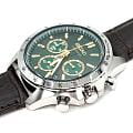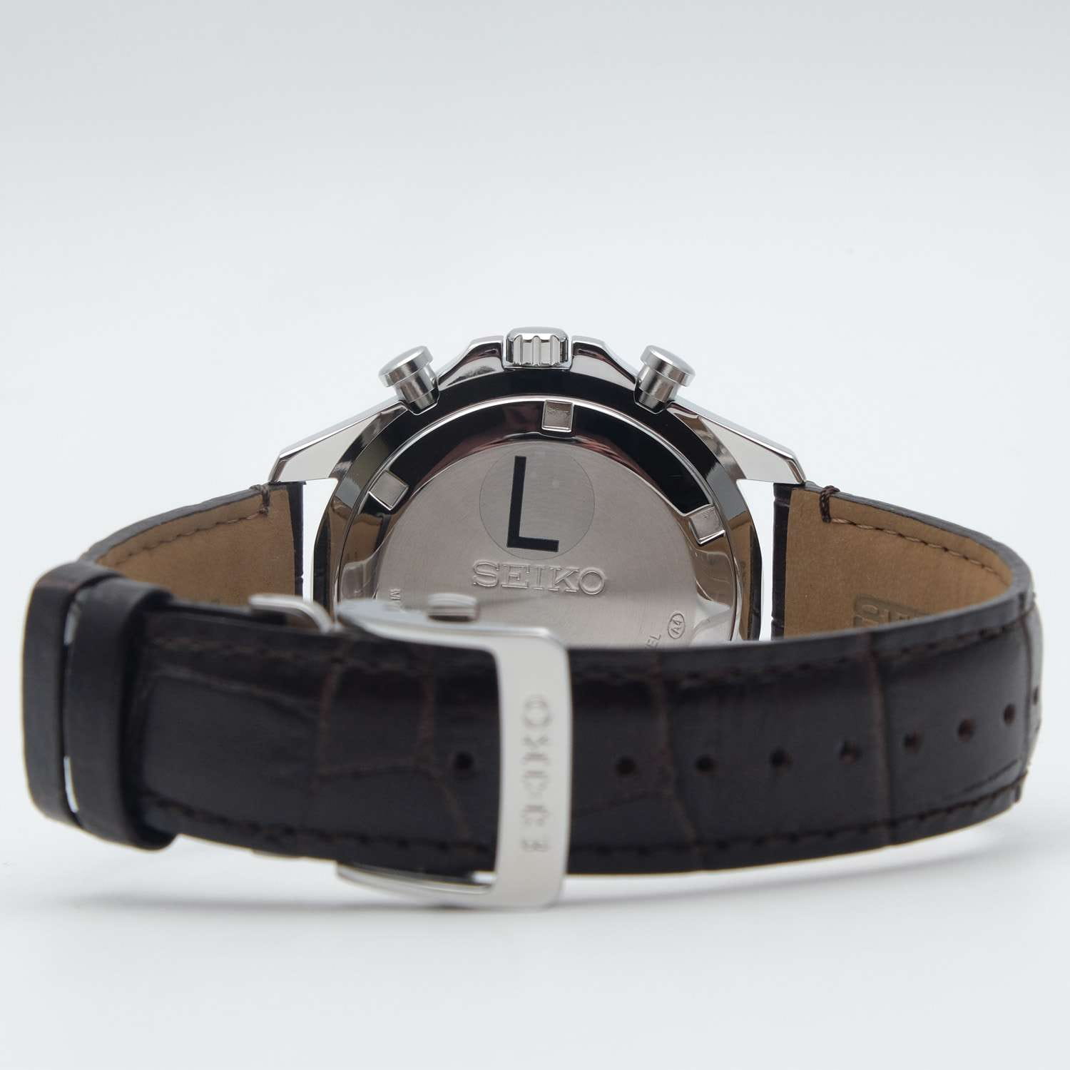Мужские кварцевые часы-хронограф Seiko — это надёжный и функциональный аксессуар. Корпус диаметром 42 мм выполнен из нержавеющей стали 316L. Циферблат оформлен штрихами и стрелками. Присутствуют три субциферблата хронографа. Окошко даты расположено в положении между 4 и 5 часов. На циферблате присутствует шкала тахиметраТахиметрРазмеченная шкала, располагается на ободке или безеле часов. Тахиметр позволяет рассчитать скорость на определённом участке пути, расстояние измеряется в километрах или милях.. Стрелки и метки с люминесцентным покрытиемЛюминесцентное покрытиеПозволяет считывать показания времени в темноте. Производители наносят на стрелки, часовые индексы, безель или поверхность циферблата светонакопительный состав, дающий холодное свечение., обеспечивающим хорошую читаемость в темноте. Циферблат защищён прочным закалённым минеральным стеклом Hardlex. Механизм — японское кварцевое движение калибра 8T67 с функциями хронографаХронографФункция позволяет измерять отрезки времени с особой точностью: часы, минуты, секунды. Верным признаком хронографа является наличие на циферблате 3 дополнительных окошек-счётчиков. и секундомераСекундомерСекундоме́р — прибор, способный измерять интервалы времени с точностью до долей секунды.. Часы оснащены коричневым кожаным ремешком на классической пряжке. Водонепроницаемость 100 м позволяет использовать часы для плавания и повседневного ношения. Идеальный выбор для тех, кто ценит японское качество и универсальный дизайн.