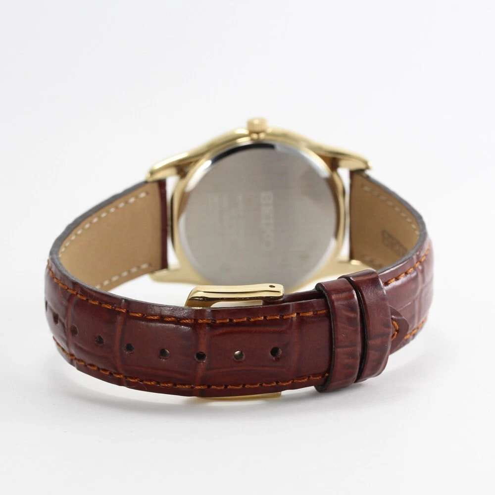 Женские кварцевые часы Seiko — это надёжный и универсальный аксессуар. Корпус диаметром 35 мм выполнен из нержавеющей стали с IP-покрытиемIP-покрытиеМетод ионного напыления. Демонстрирует повышенную устойчивость к истиранию, окислению и химическим веществам. Под воздействием высокого давления и температуры около 1500°C молекулы металла надёжно соединяются с частицами корпуса часов. цвета жёлтого золота. Циферблат белого цвета оформлен индексами и стрелками, включая центральную секундную стрелку. Циферблат защищён прочным закалённым минеральным стеклом Hardlex минеральным стекломМинеральное стеклоМинеральное стекло представляет собой искусственно выращенный минерал кварца. Такое стекло отличается особой устойчивостью к повреждениям и царапинам. Уступает по некоторым качествам сапфировому стеклу.. Механизм — японское кварцевое движение калибра 7N01 с высокой точностью хода (±10–15 сек. в месяц). Часы оснащены коричневым кожаным ремешком на классической пряжке. Водонепроницаемость 30 м позволяет использовать часы в повседневных условиях. Идеальный выбор для тех, кто ценит японское качество и классический дизайн.