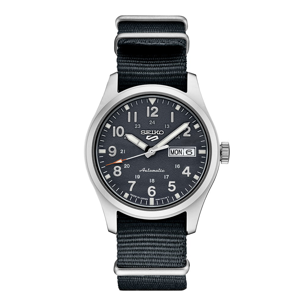 Механические часы Seiko 5 Sports Field series SRPG31K1S с автоподзаводом и возможностью ручной подзаводки оснащены калибром 4R36, в котором используется 24 драгоценных камня. Механизм обеспечивает запас хода до 41 часа и дополнен функцией стоп-секунды для точной установки времени, а также отображением дня недели и даты. Корпус изготовлен из нержавеющей стали и защищён минеральным стекломМинеральное стеклоМинеральное стекло представляет собой искусственно выращенный минерал кварца. Такое стекло отличается особой устойчивостью к повреждениям и царапинам. Уступает по некоторым качествам сапфировому стеклу. Hardlex с выпуклой формой, устойчивым к мелким повреждениям. Циферблат дополнен стрелками и метками с фирменным люминесцентным покрытиемЛюминесцентное покрытиеПозволяет считывать показания времени в темноте. Производители наносят на стрелки, часовые индексы, безель или поверхность циферблата светонакопительный состав, дающий холодное свечение. LumiBrite, обеспечивающим отличную читаемость даже в темноте. Часы обладают водонепроницаемостью , что соответствует защите на глубине до 100 метров, и имеют защиту от магнитных полей до 4800 А/м. Задняя крышка — завинчивающаяся и прозрачная, что позволяет наблюдать за работой механизма и подчёркивает внимание к внутренней отделке. Ремешок из прочного нейлона добавляет модели спортивного стиля и обеспечивает лёгкость и комфорт при ношении. Расстояние между ушками составляет 20 мм, что делает модель совместимой с различными типами ремешков. Эти часы станут универсальным аксессуаром для тех, кто ценит сочетание технологичности, прочности и эстетики — идеальный выбор как для повседневного использования, так и для активного образа жизни.